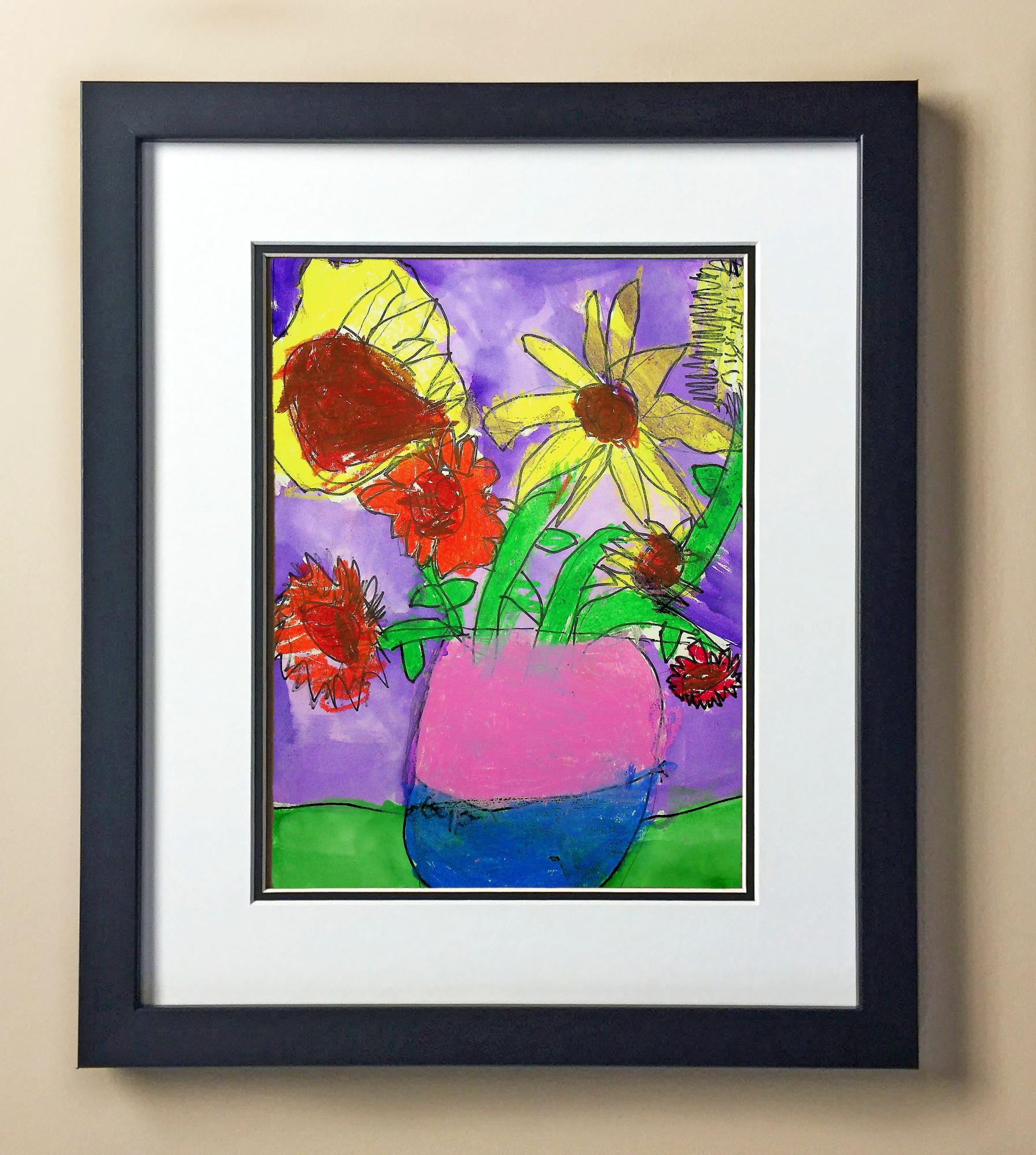 Included with the purchase is the Students Artwork, Frame, double matboard, shatter proof plexiglass, and a ready to hang backerboard with turnbuttons