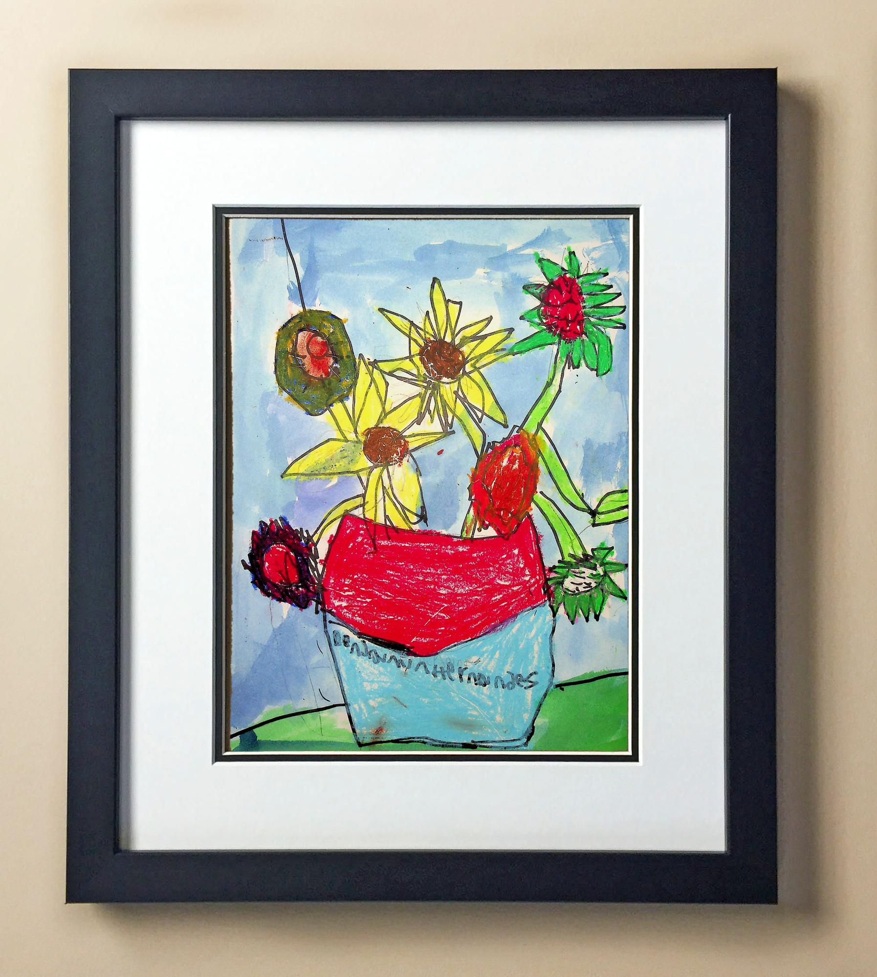 Included with the purchase is the Students Artwork, Frame, double matboard, shatter proof plexiglass, and a ready to hang backerboard with turnbuttons