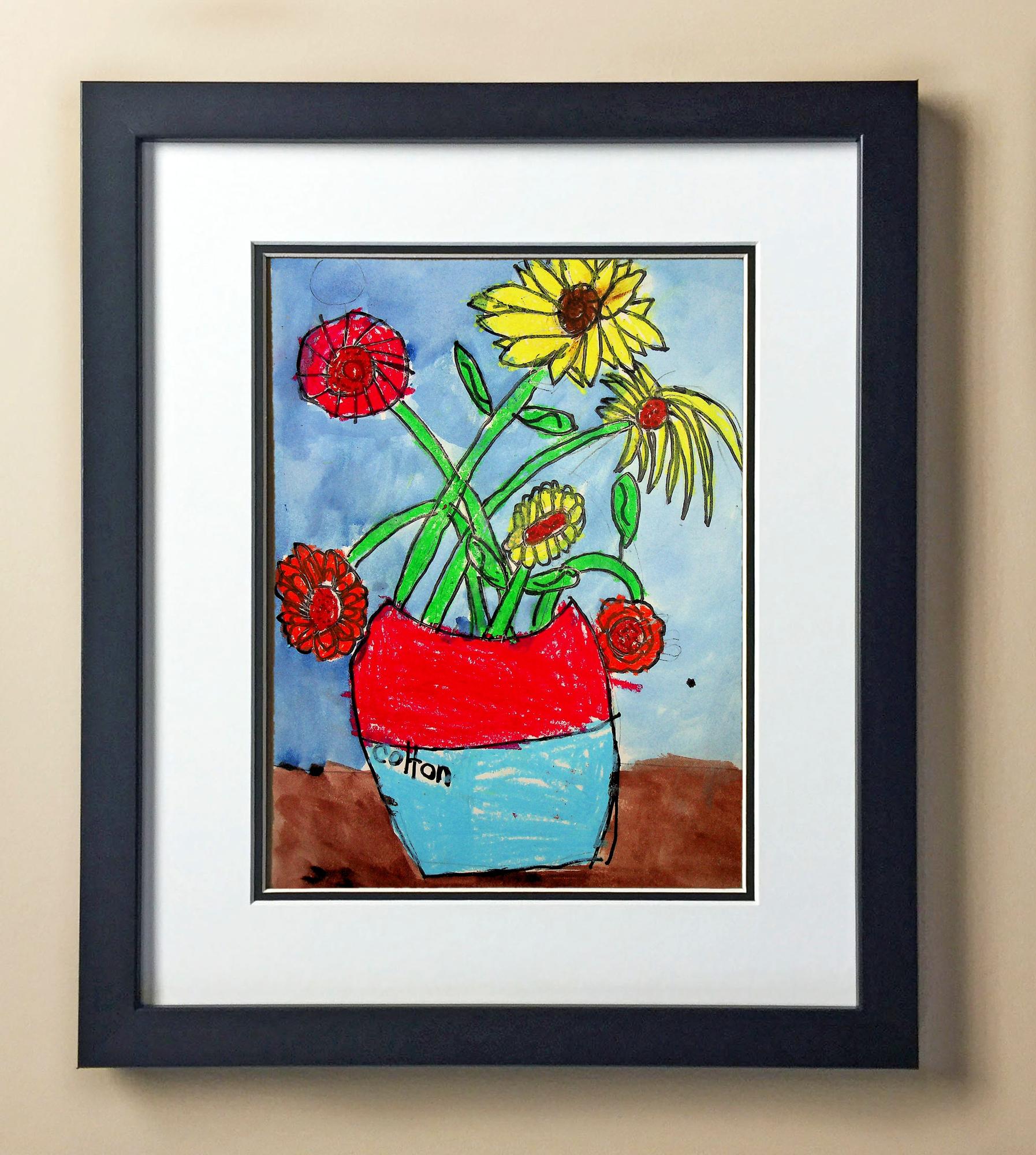 Included with the purchase is the Students Artwork, Frame, double matboard, shatter proof plexiglass, and a ready to hang backerboard with turnbuttons