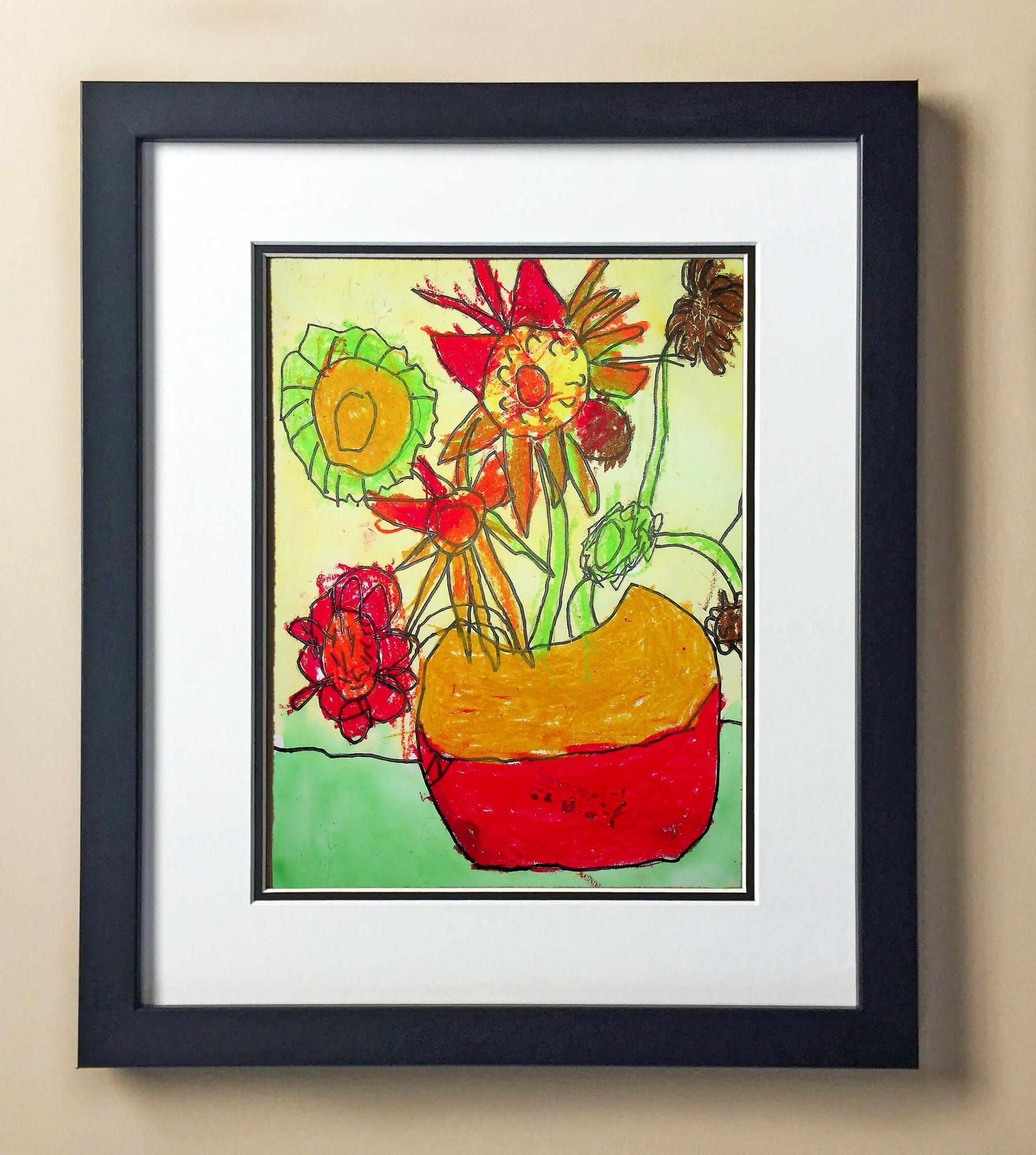 Included with the purchase is the Students Artwork, Frame, double matboard, shatter proof plexiglass, and a ready to hang backerboard with turnbuttons