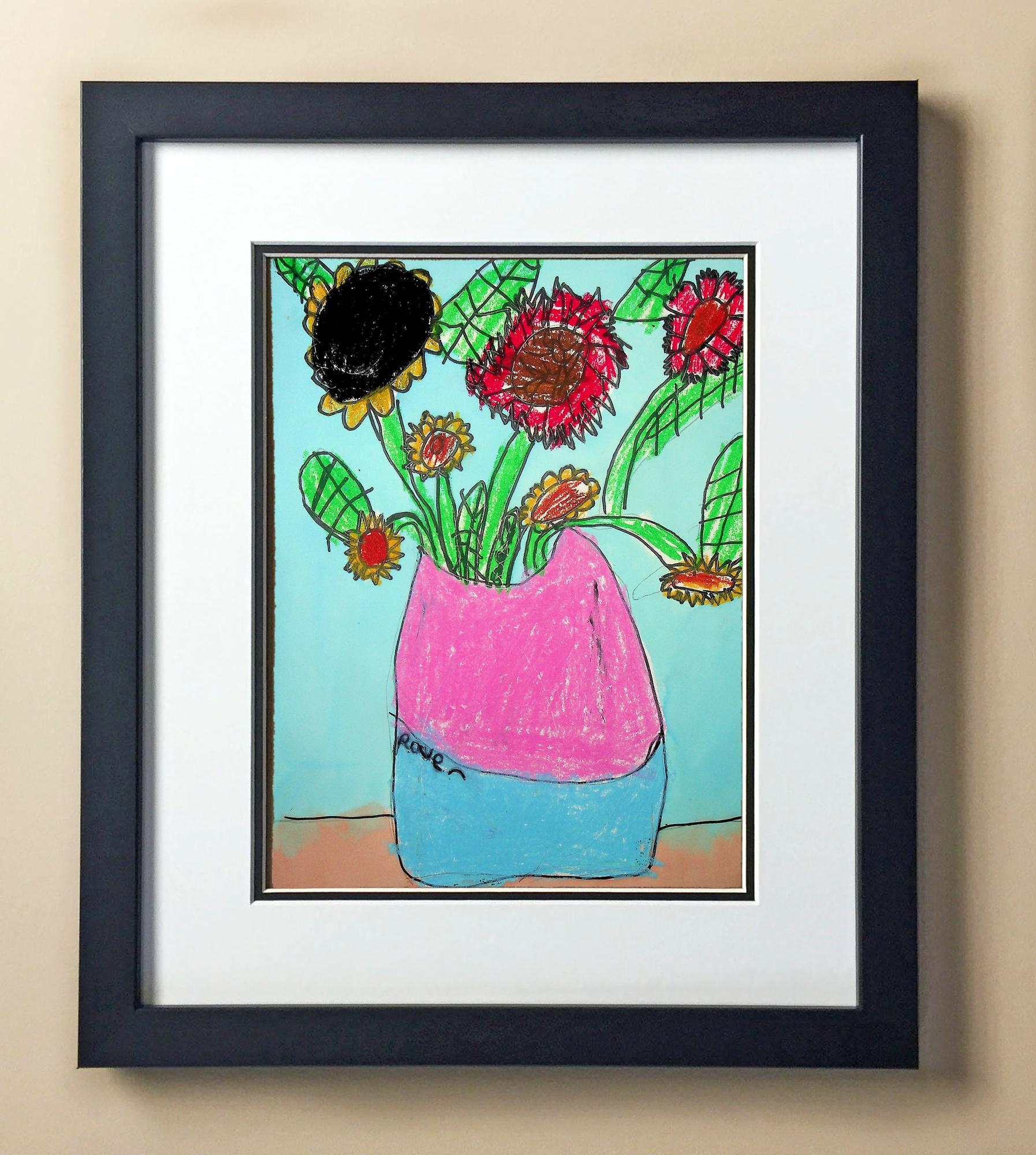 Included with the purchase is the Students Artwork, Frame, double matboard, shatter proof plexiglass, and a ready to hang backerboard with turnbuttons