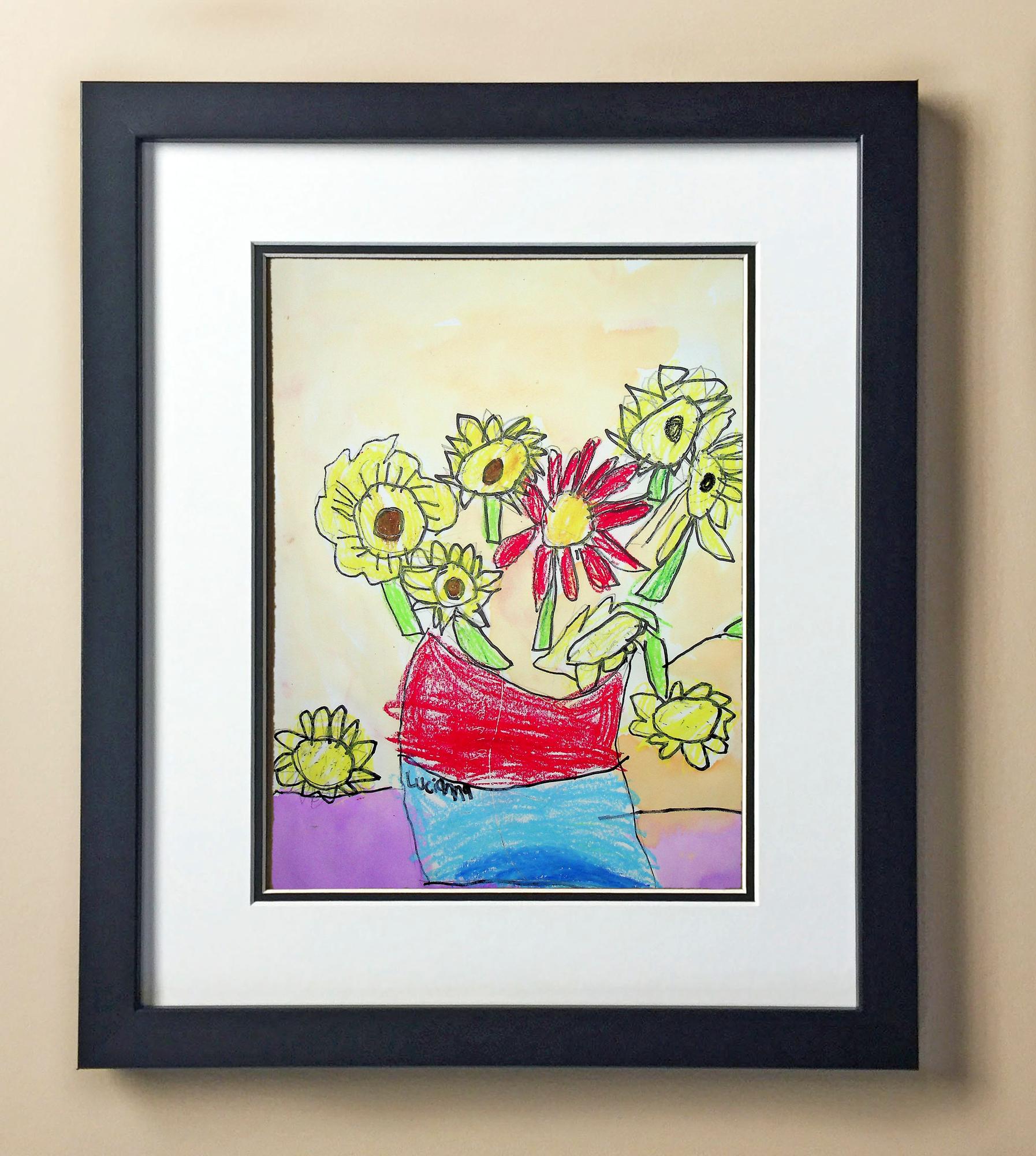 Included with the purchase is the Students Artwork, Frame, double matboard, shatter proof plexiglass, and a ready to hang backerboard with turnbuttons