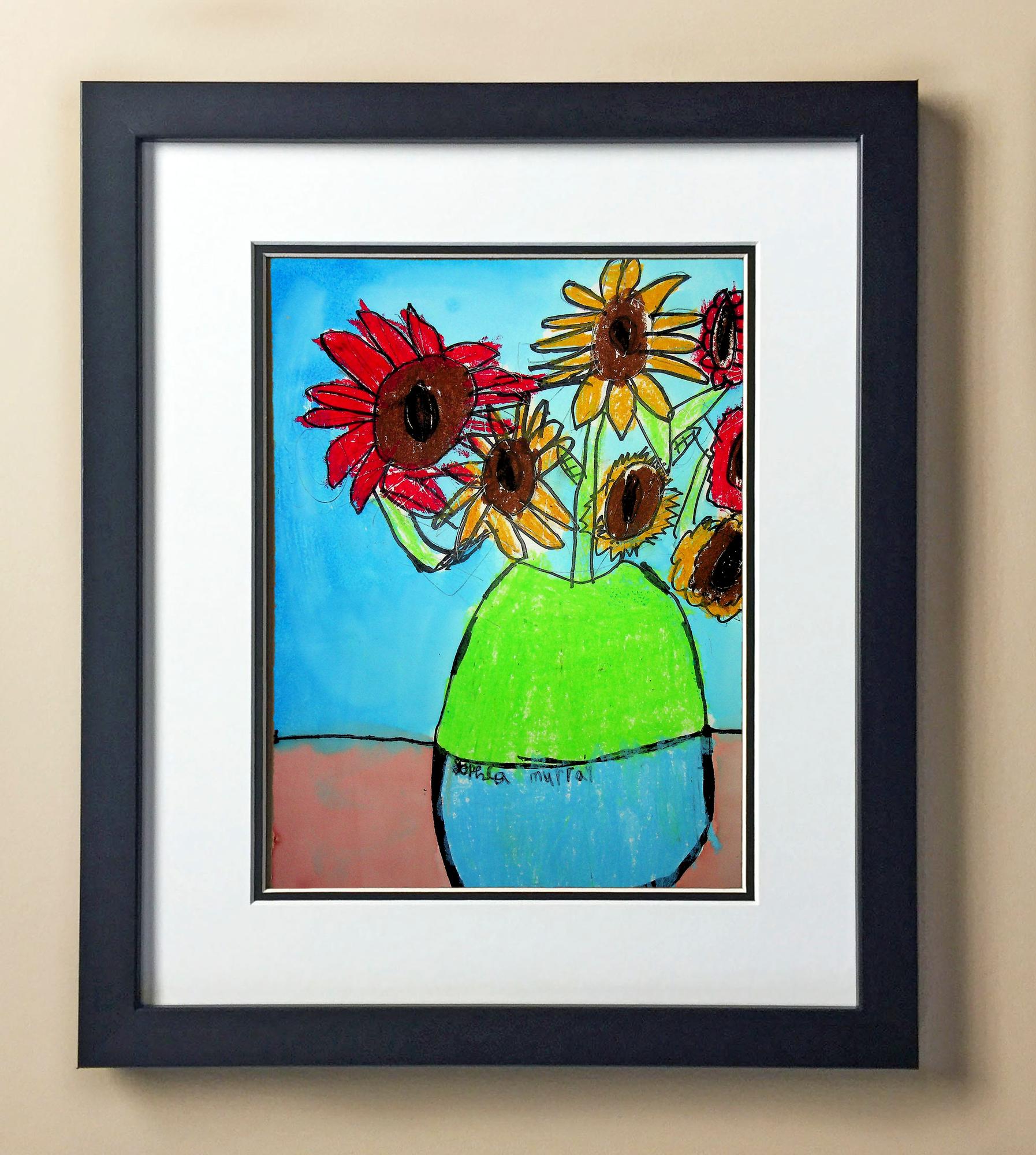 Included with the purchase is the Students Artwork, Frame, double matboard, shatter proof plexiglass, and a ready to hang backerboard with turnbuttons