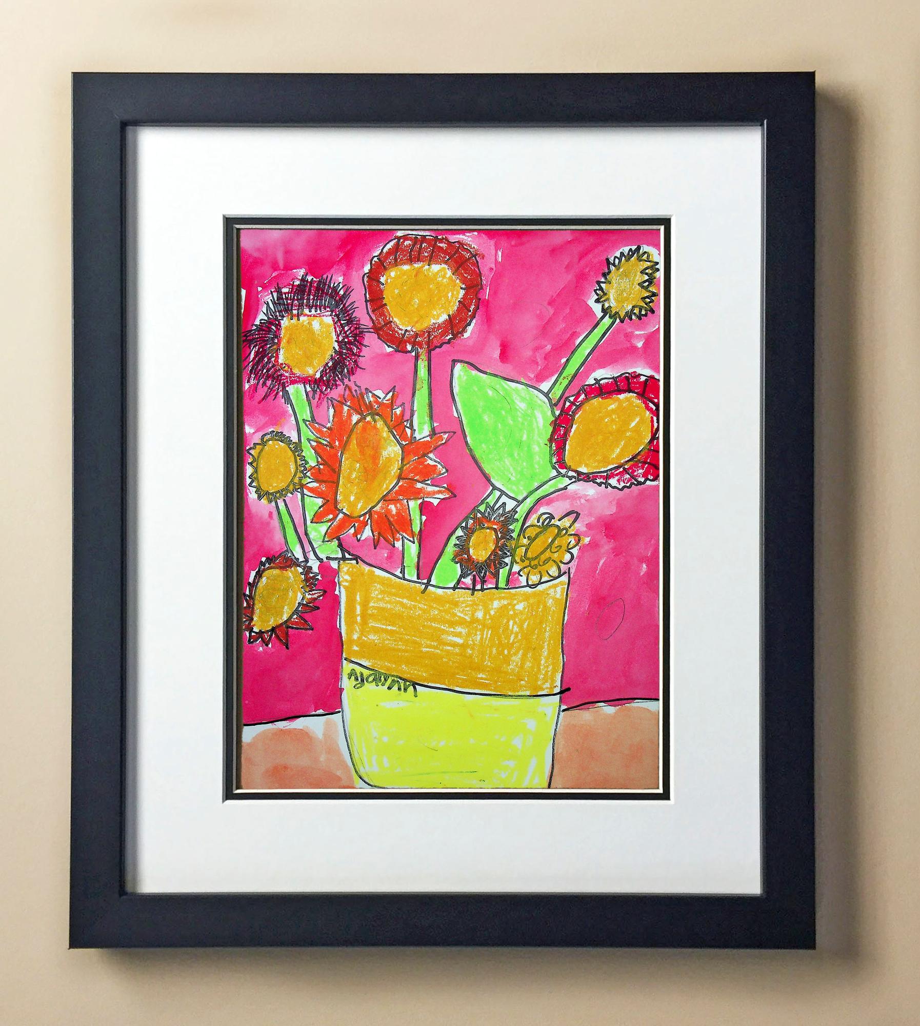 Included with the purchase is the Students Artwork, Frame, double matboard, shatter proof plexiglass, and a ready to hang backerboard with turnbuttons