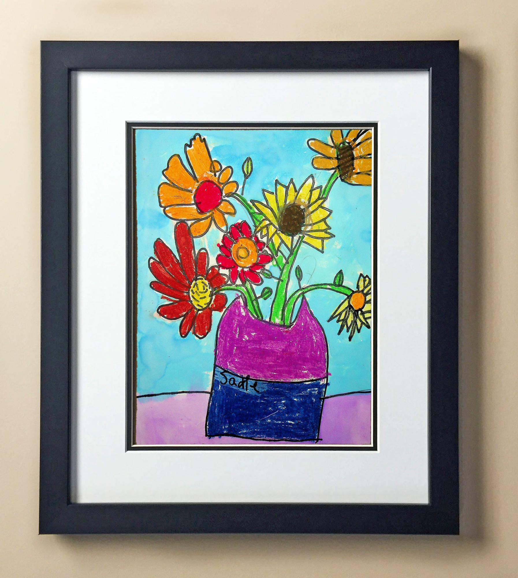 Included with the purchase is the Students Artwork, Frame, double matboard, shatter proof plexiglass, and a ready to hang backerboard with turnbuttons