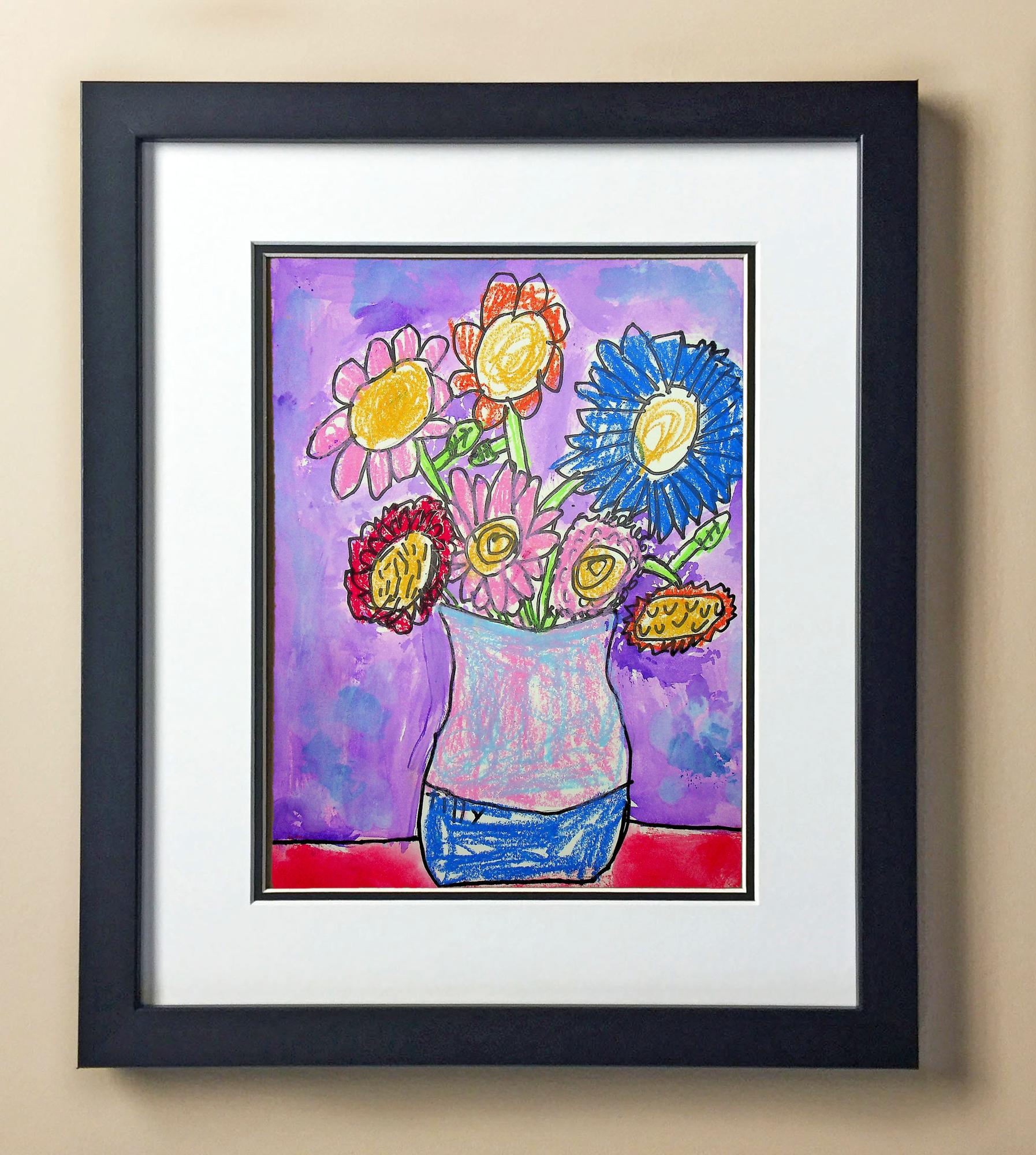 Included with the purchase is the Students Artwork, Frame, double matboard, shatter proof plexiglass, and a ready to hang backerboard with turnbuttons