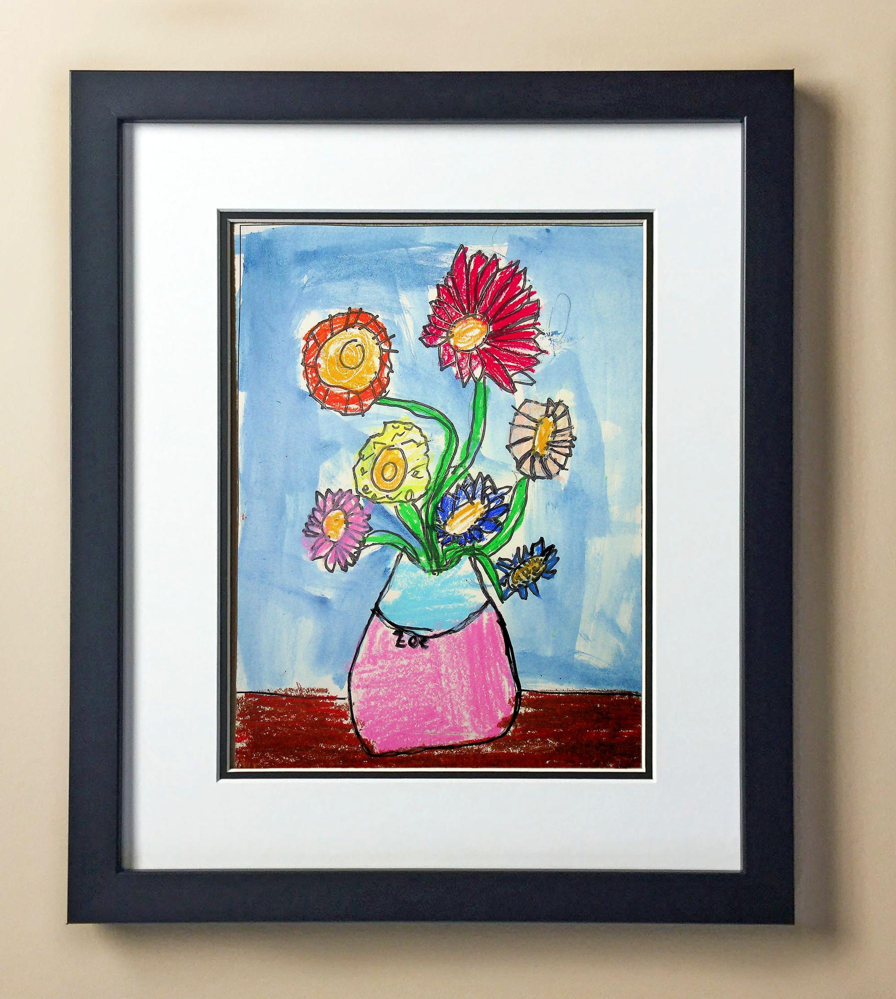 Included with the purchase is the Students Artwork, Frame, double matboard, shatter proof plexiglass, and a ready to hang backerboard with turnbuttons