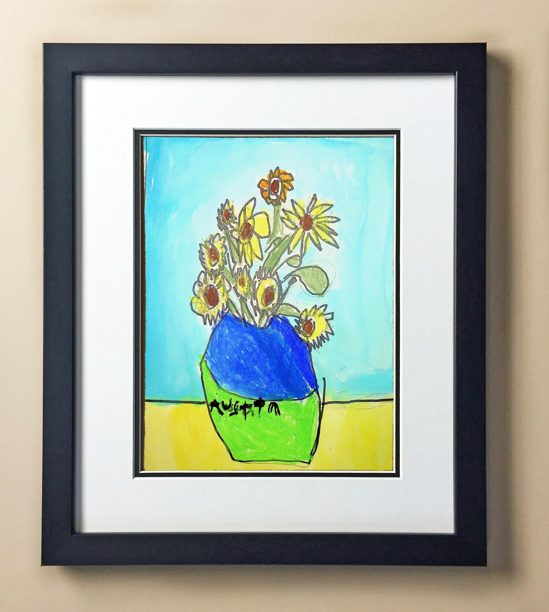 Included with the purchase is the Students Artwork, Frame, double matboard, shatter proof plexiglass, and a ready to hang backerboard with turnbuttons