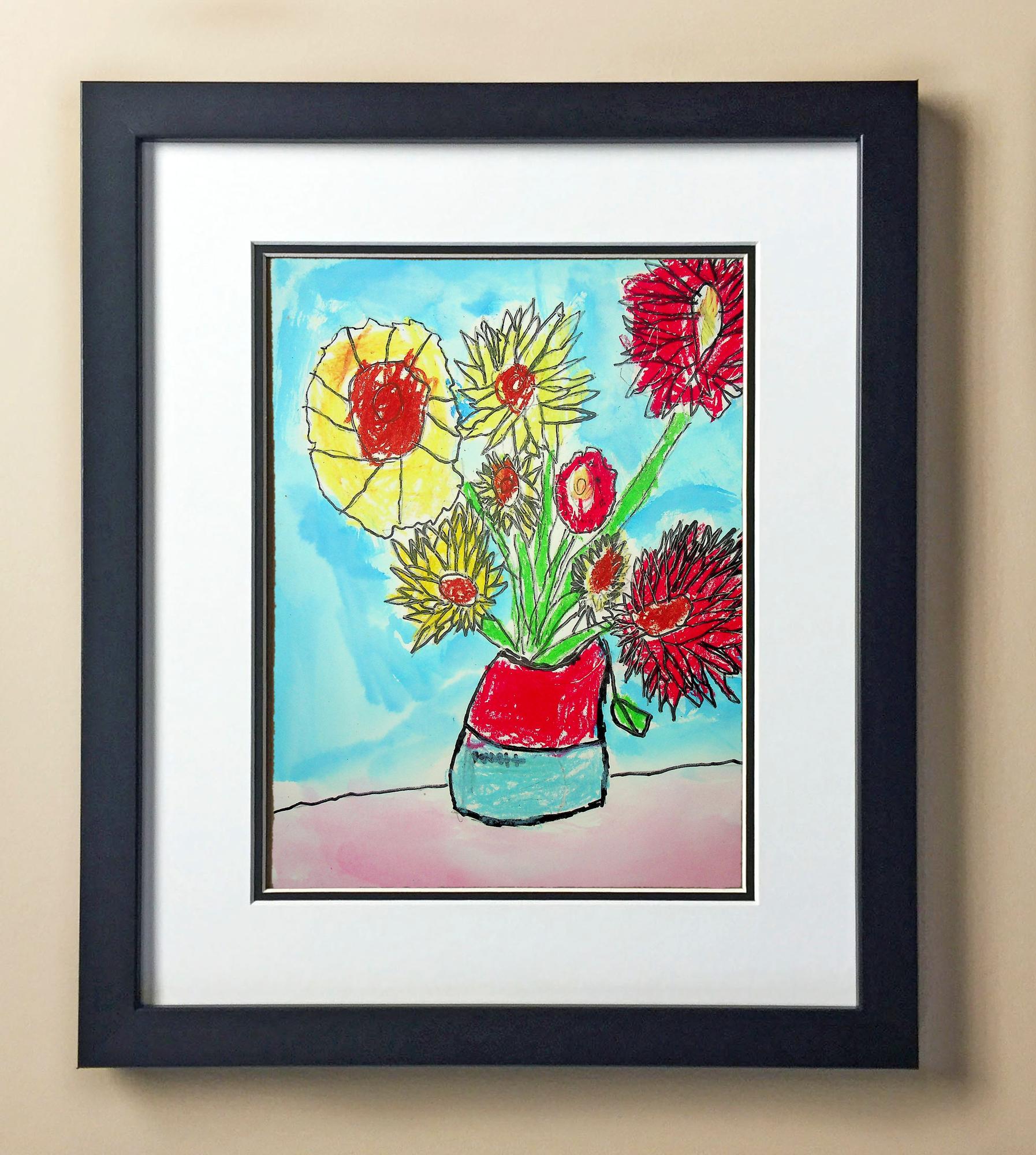 Included with the purchase is the Students Artwork, Frame, double matboard, shatter proof plexiglass, and a ready to hang backerboard with turnbuttons