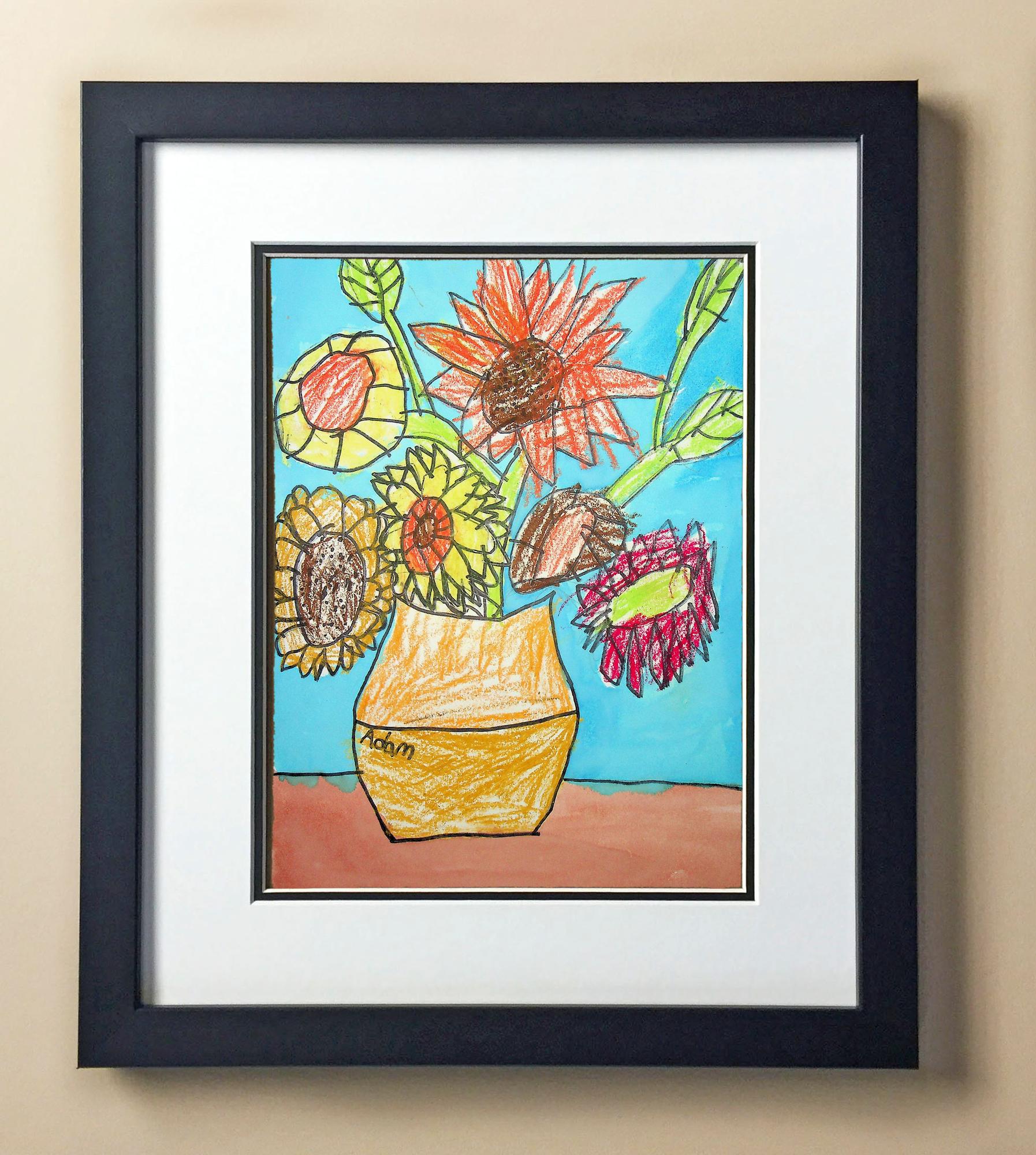 Included with the purchase is the Students Artwork, Frame, double matboard, shatter proof plexiglass, and a ready to hang backerboard with turnbuttons