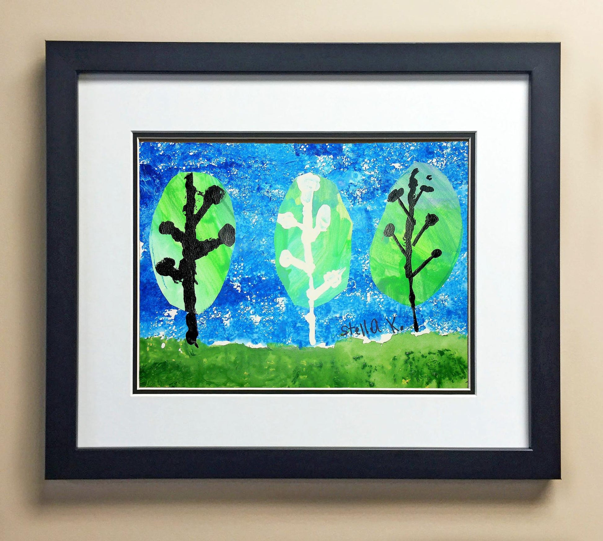 Included with the purchase is the Students Artwork, Frame, double matboard, shatter proof plexiglass, and a ready to hang backerboard with turnbuttons
