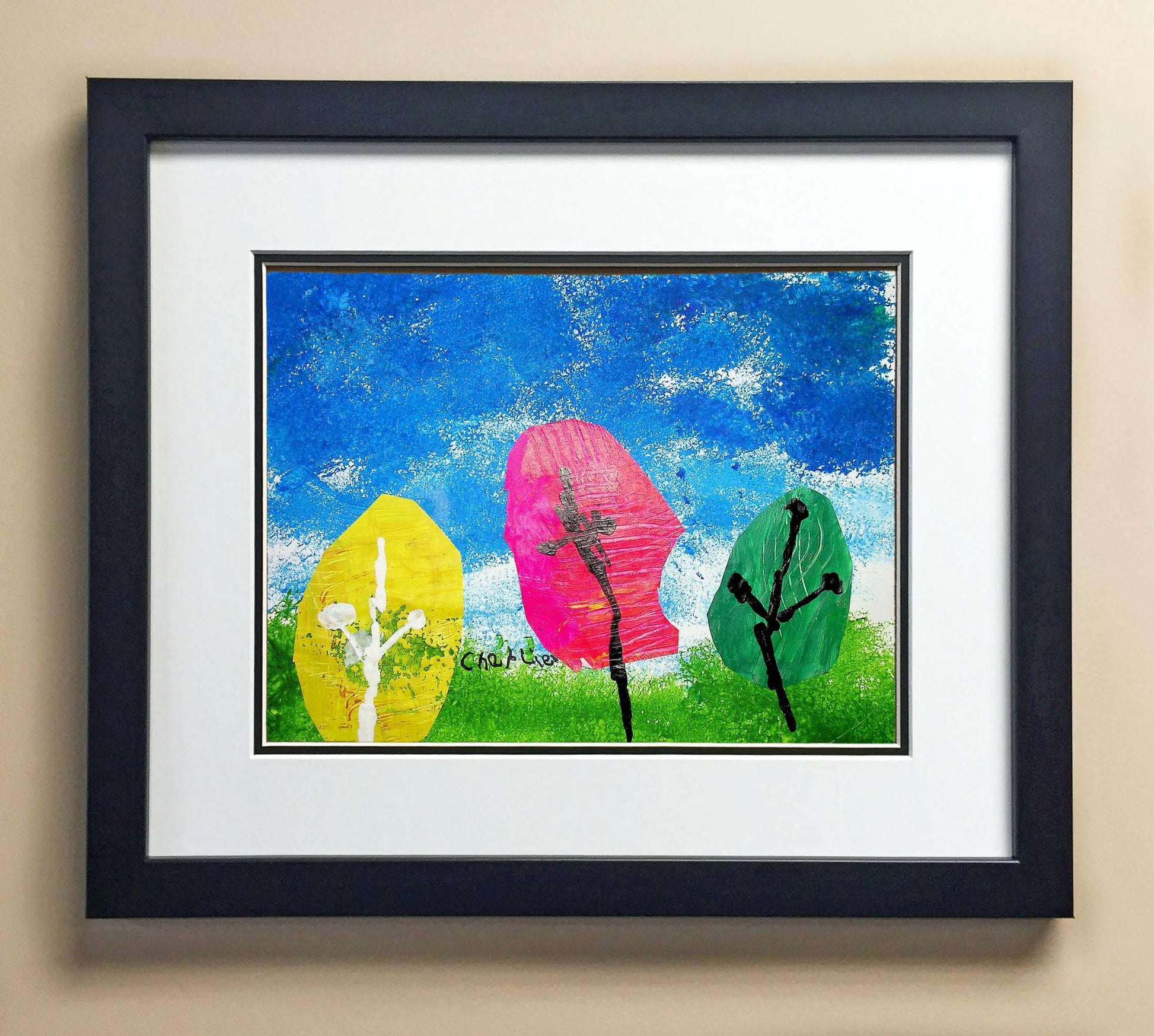 Included with the purchase is the Students Artwork, Frame, double matboard, shatter proof plexiglass, and a ready to hang backerboard with turnbuttons