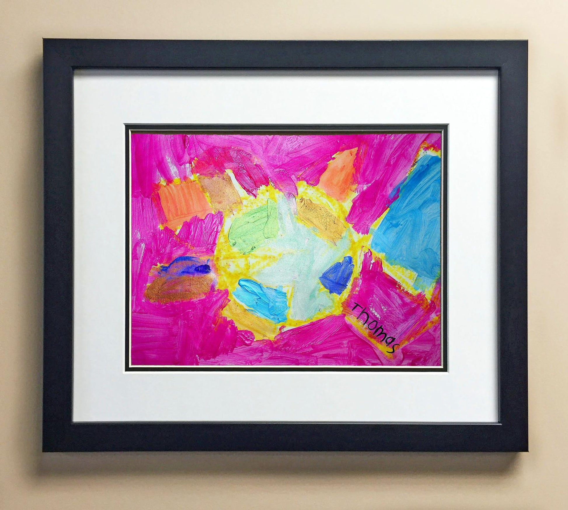 Included with the purchase is the Students Artwork, Frame, double matboard, shatter proof plexiglass, and a ready to hang backerboard with turnbuttons