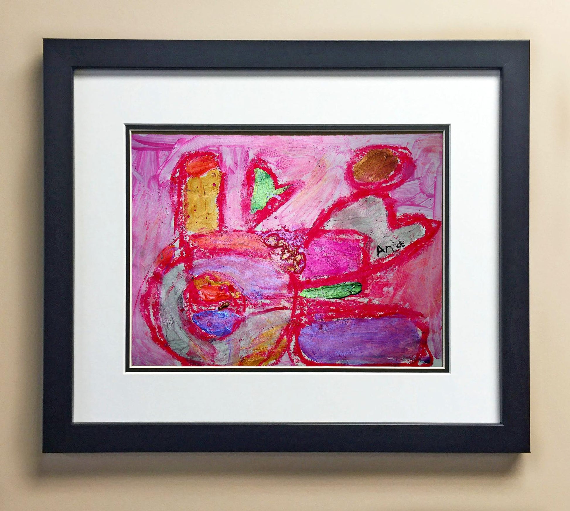Included with the purchase is the Students Artwork, Frame, double matboard, shatter proof plexiglass, and a ready to hang backerboard with turnbuttons