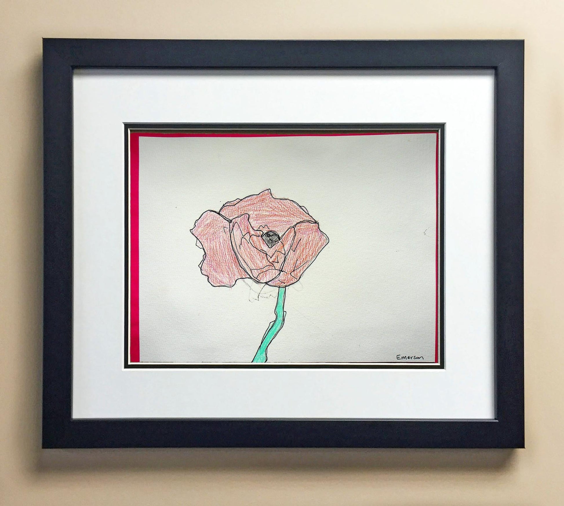 Included with the purchase is the Students Artwork, Frame, double matboard, shatter proof plexiglass, and a ready to hang backerboard with turnbuttons
