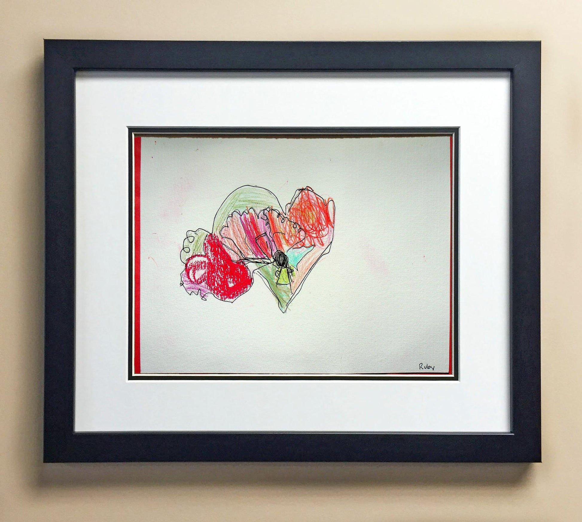 Included with the purchase is the Students Artwork, Frame, double matboard, shatter proof plexiglass, and a ready to hang backerboard with turnbuttons