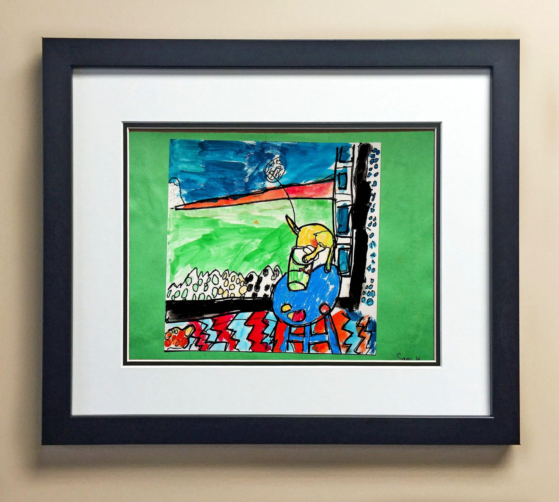Included with the purchase is the Students Artwork, Frame, double matboard, shatter proof plexiglass, and a ready to hang backerboard with turnbuttons