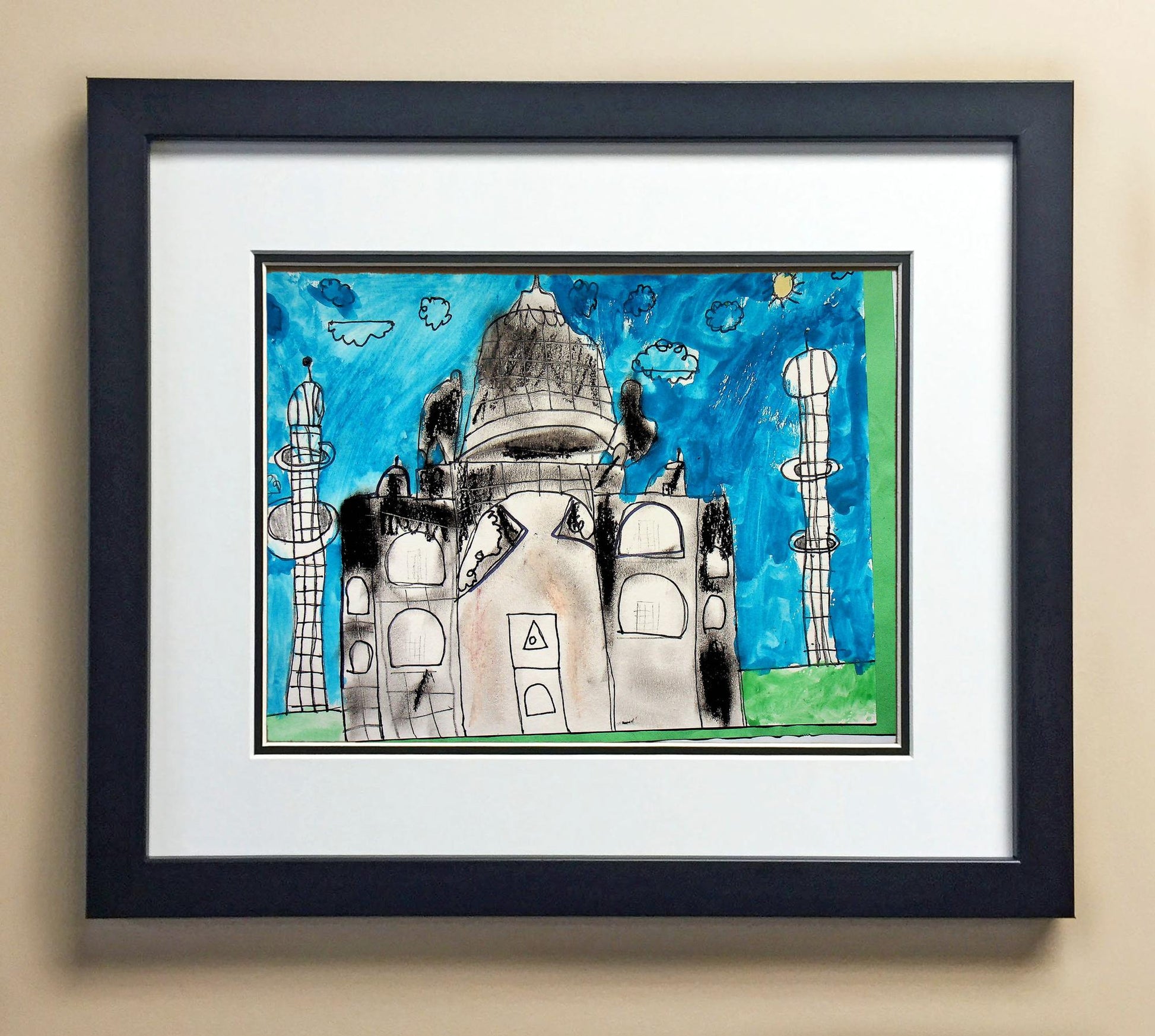 Included with the purchase is the Students Artwork, Frame, double matboard, shatter proof plexiglass, and a ready to hang backerboard with turnbuttons