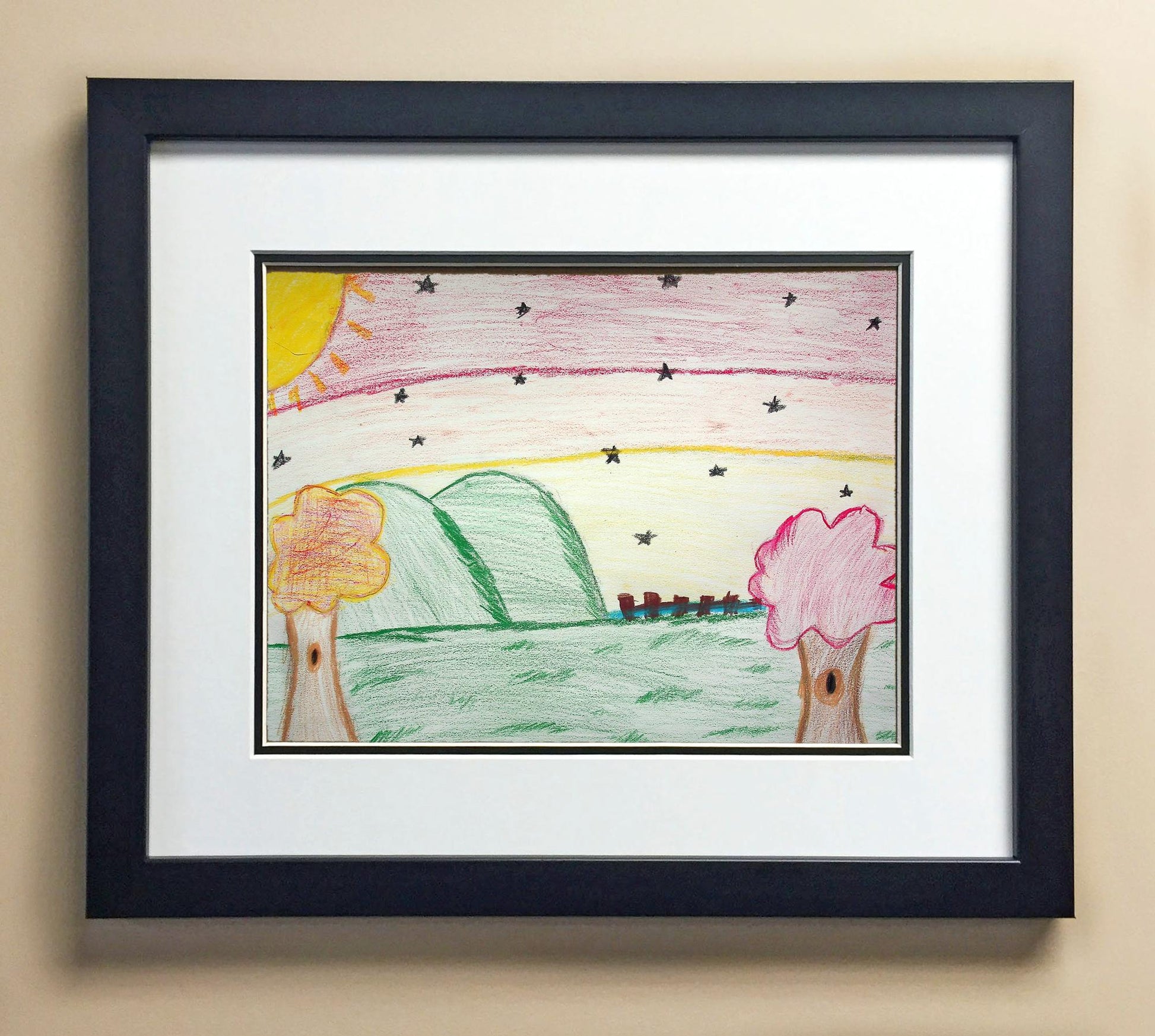 Included with the purchase is the Students Artwork, Frame, double matboard, shatter proof plexiglass, and a ready to hang backerboard with turnbuttons