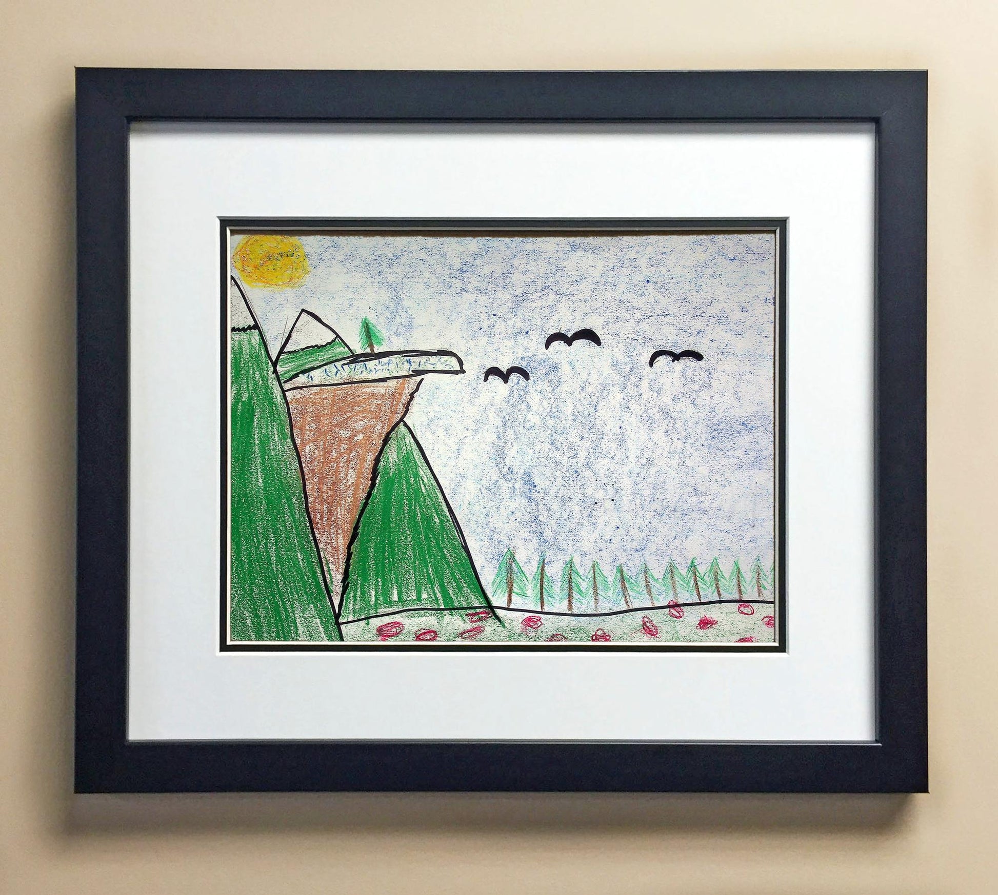 Included with the purchase is the Students Artwork, Frame, double matboard, shatter proof plexiglass, and a ready to hang backerboard with turnbuttons