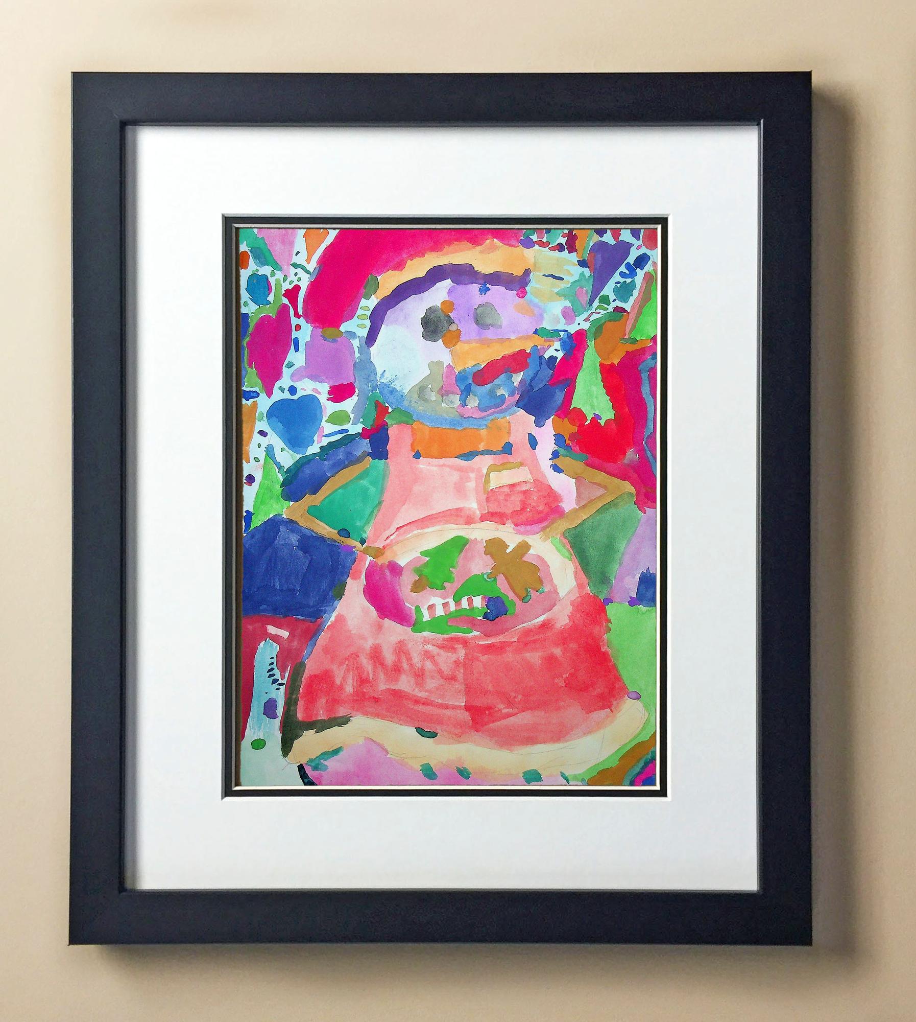 Included with the purchase is the Students Artwork, Frame, double matboard, shatter proof plexiglass, and a ready to hang backerboard with turnbuttons