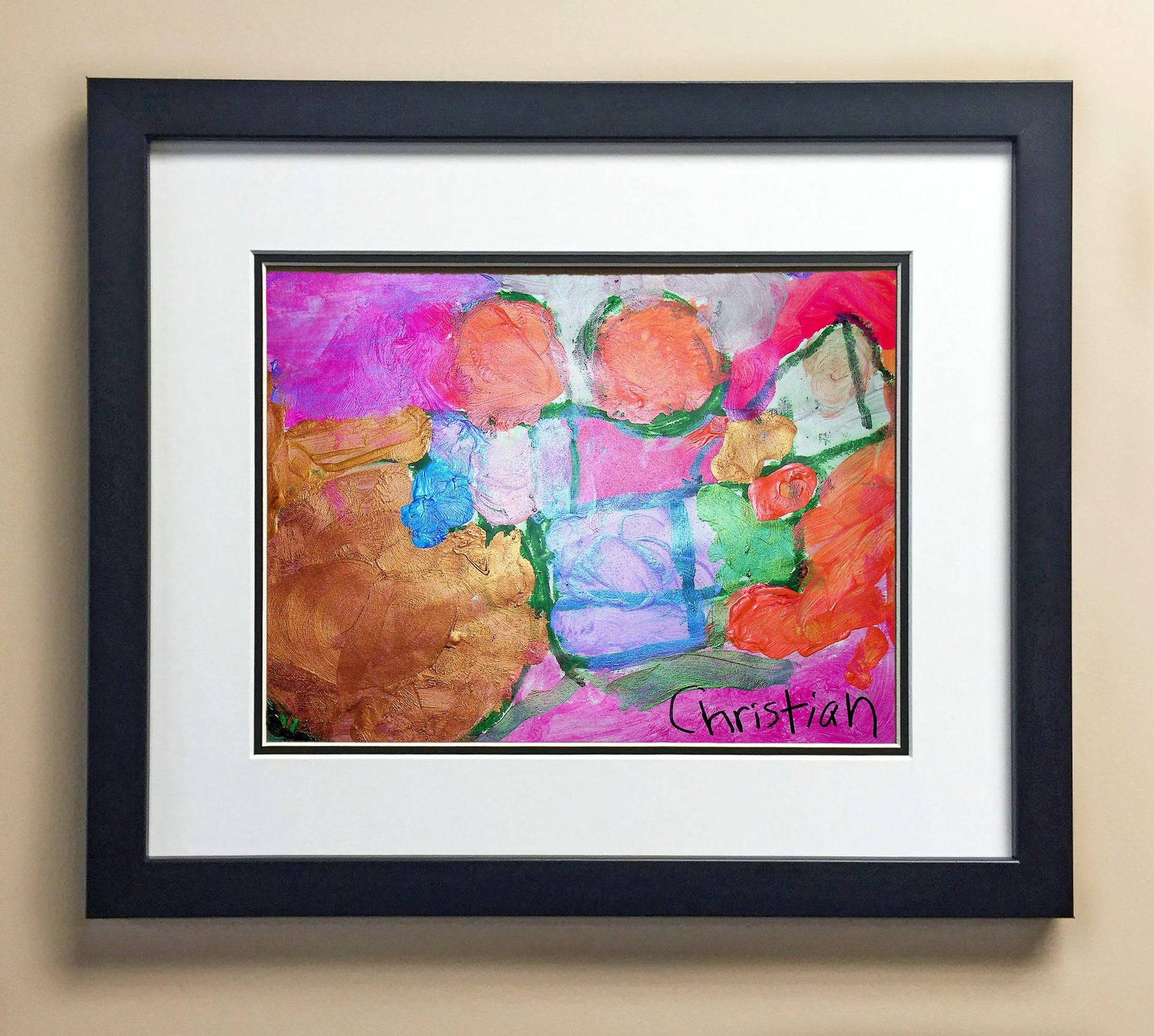 Included with the purchase is the Students Artwork, Frame, double matboard, shatter proof plexiglass, and a ready to hang backerboard with turnbuttons