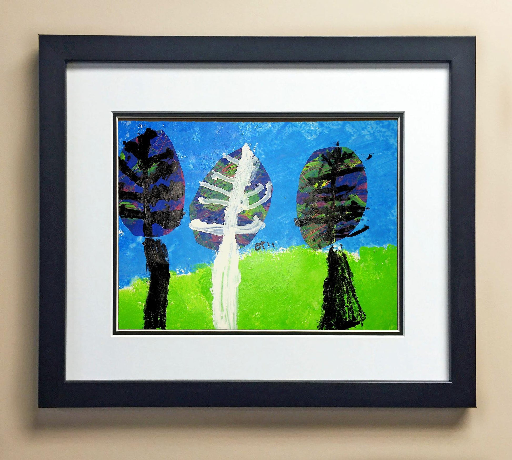 Included with the purchase is the Students Artwork, Frame, double matboard, shatter proof plexiglass, and a ready to hang backerboard with turnbuttons