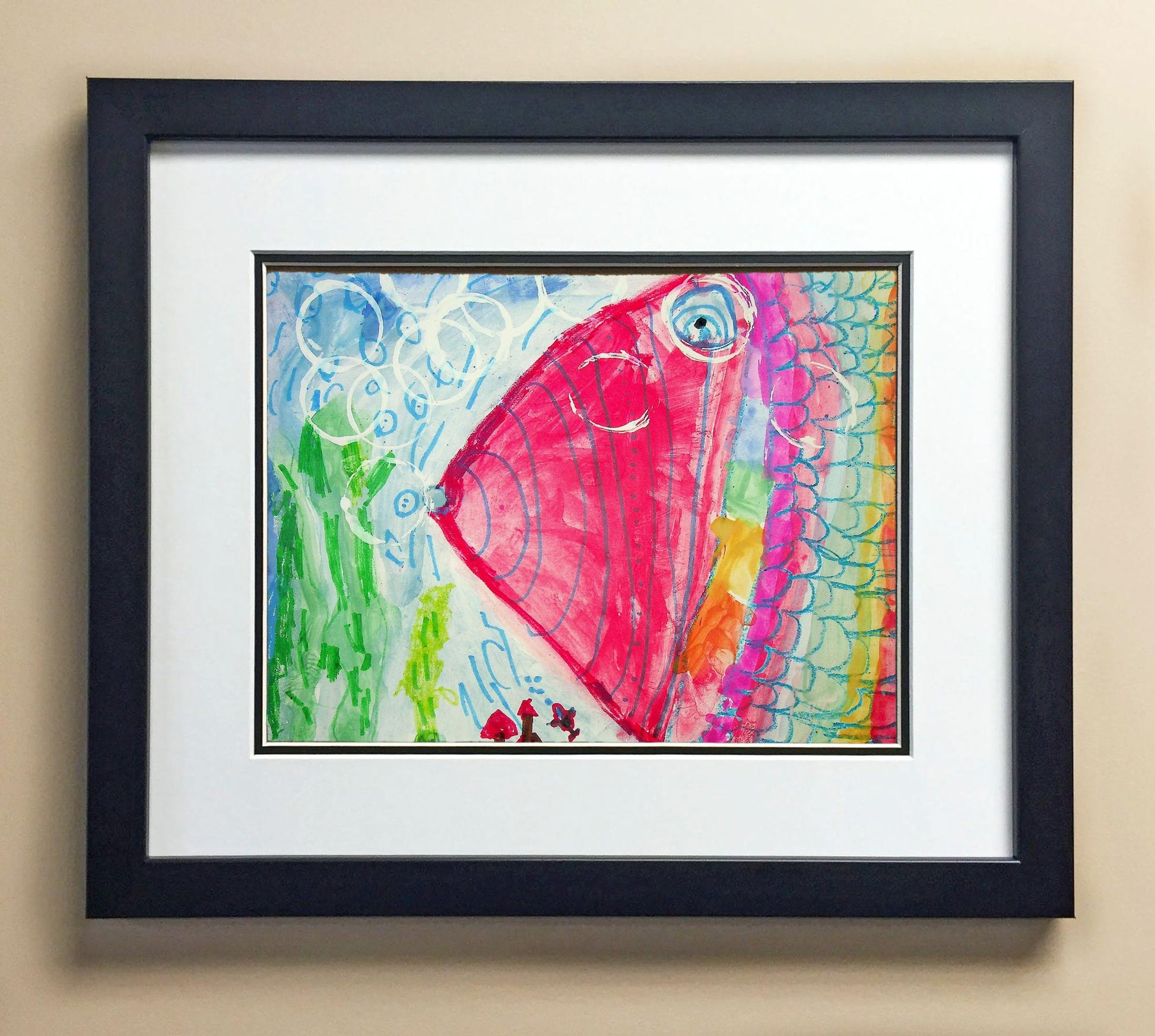 Included with the purchase is the Students Artwork, Frame, double matboard, shatter proof plexiglass, and a ready to hang backerboard with turnbuttons