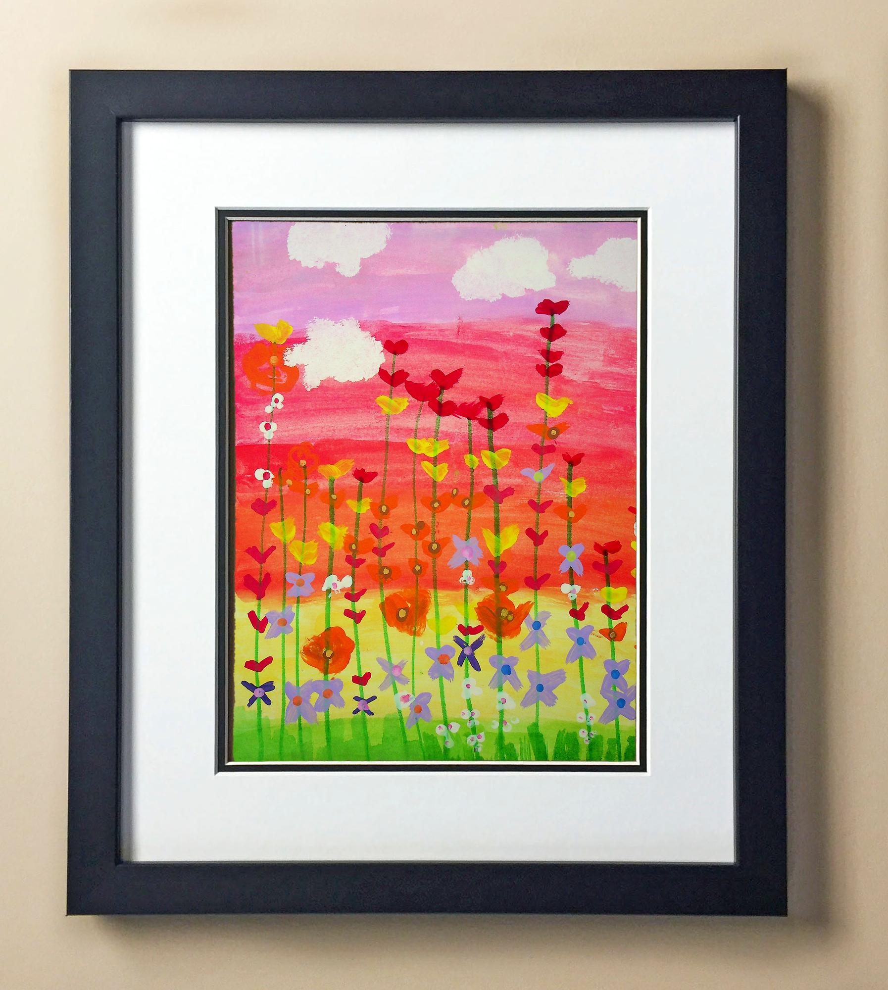 Included with the purchase is the Students Artwork, Frame, double matboard, shatter proof plexiglass, and a ready to hang backerboard with turnbuttons