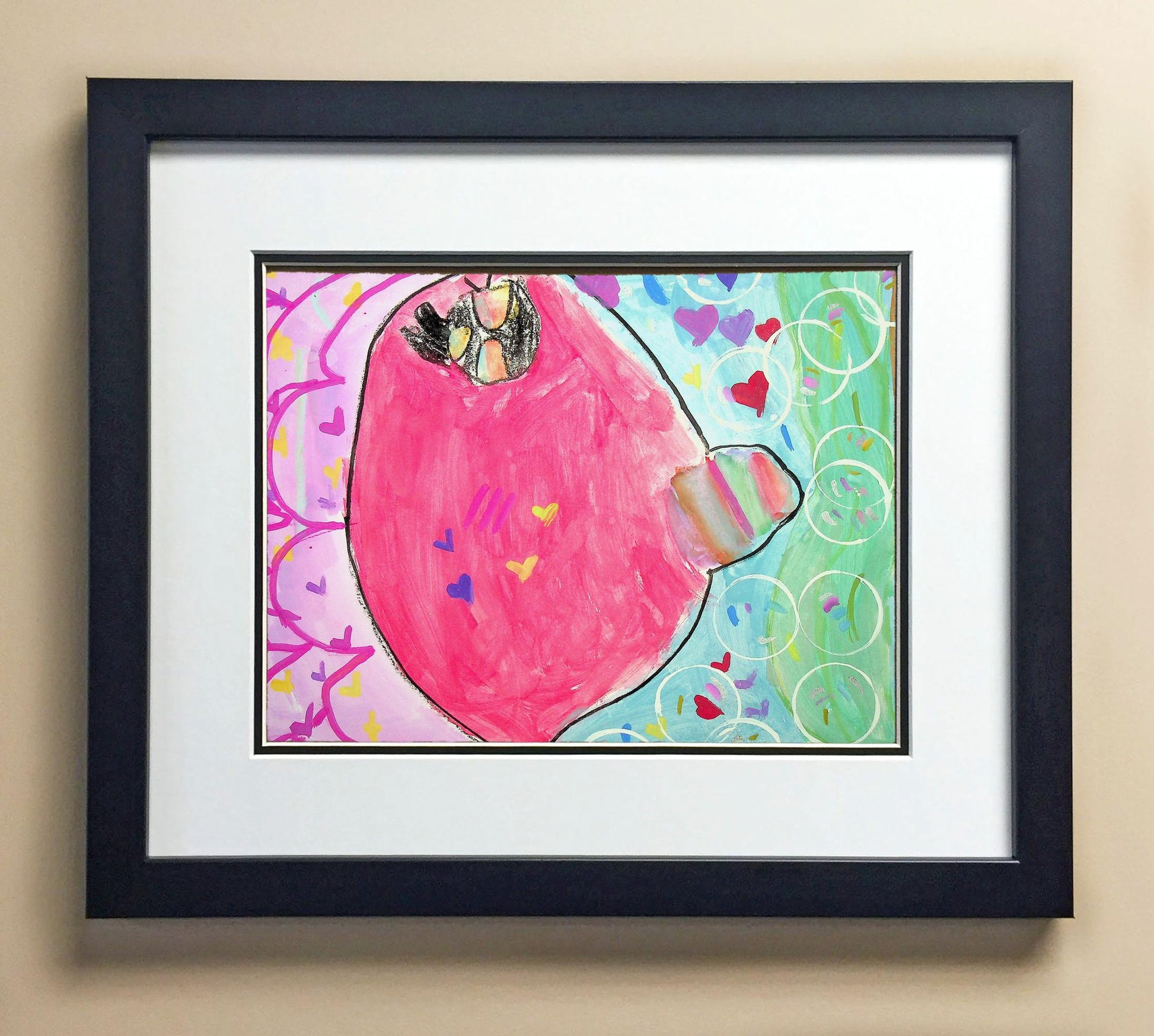 Included with the purchase is the Students Artwork, Frame, double matboard, shatter proof plexiglass, and a ready to hang backerboard with turnbuttons