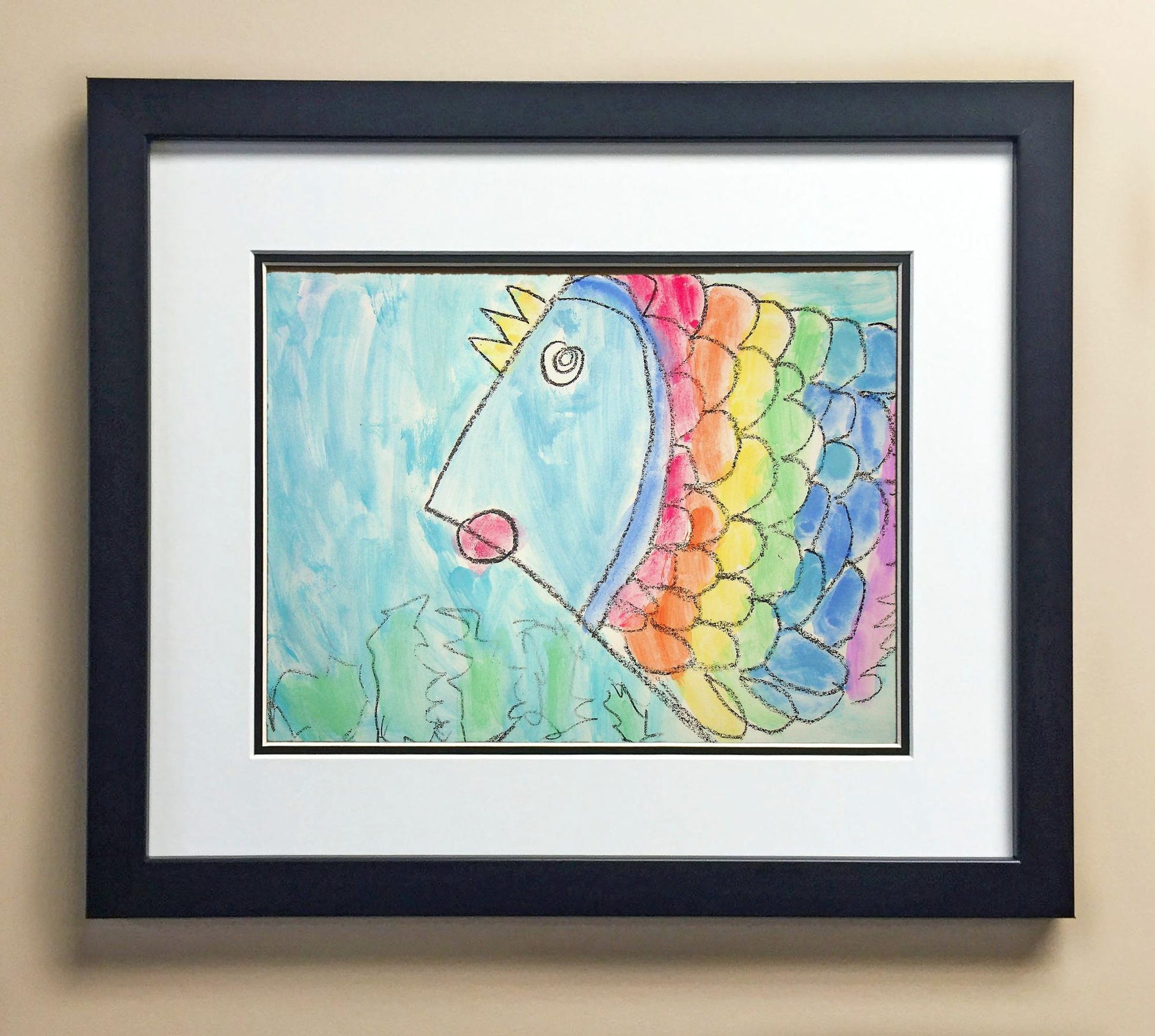 Included with the purchase is the Students Artwork, Frame, double matboard, shatter proof plexiglass, and a ready to hang backerboard with turnbuttons