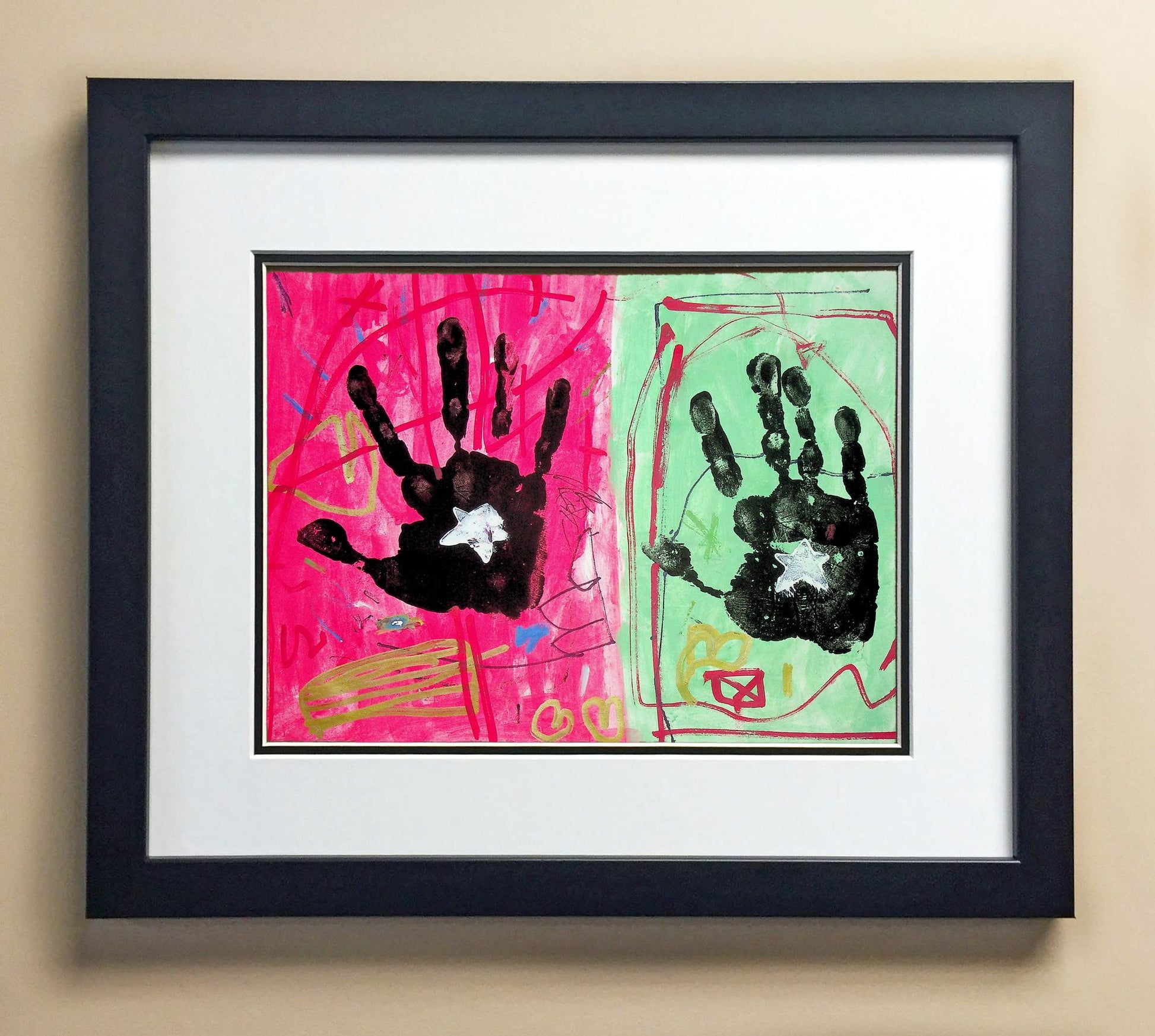 Included with the purchase is the Students Artwork, Frame, double matboard, shatter proof plexiglass, and a ready to hang backerboard with turnbuttons