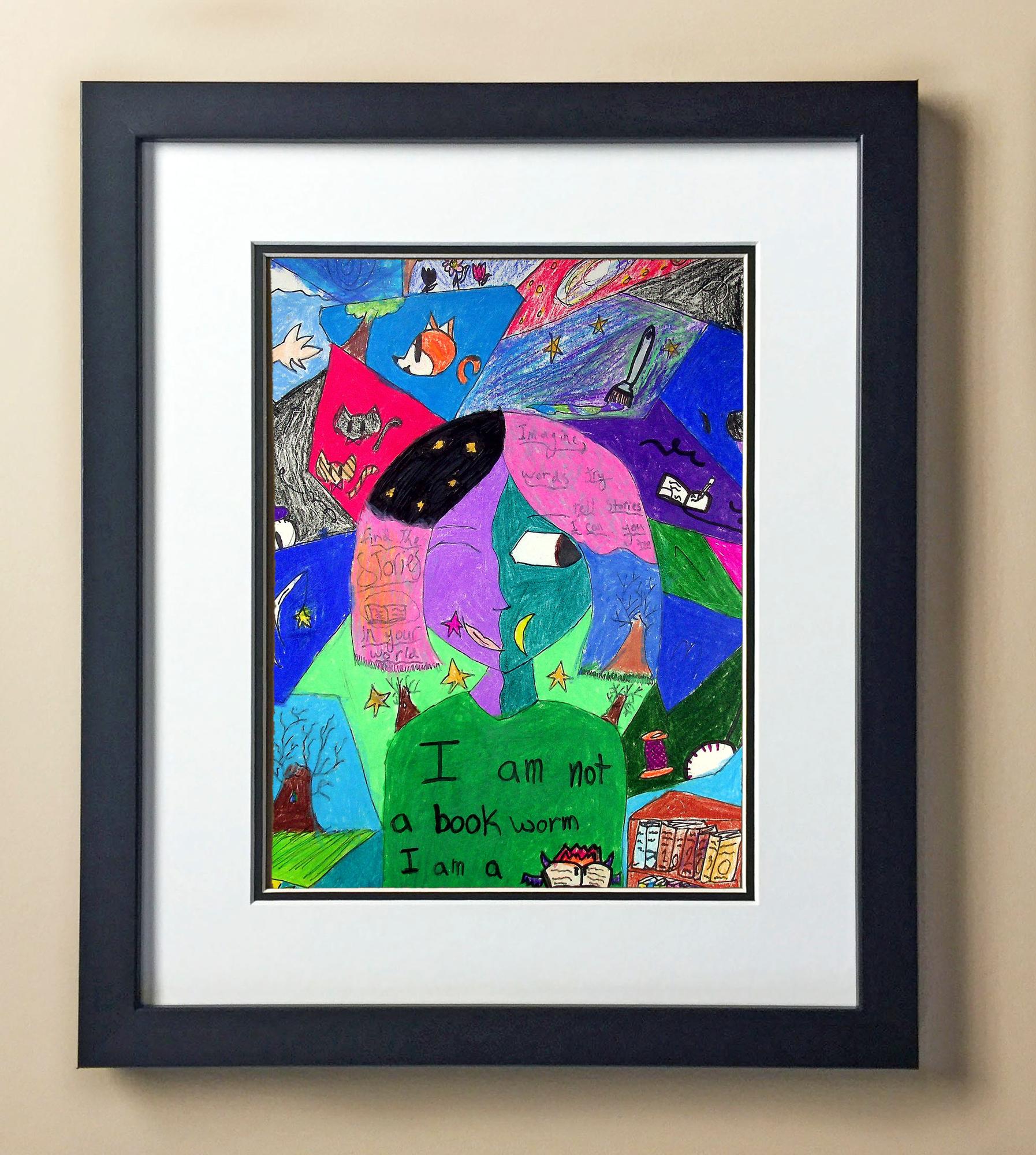 Included with the purchase is the Students Artwork, Frame, double matboard, shatter proof plexiglass, and a ready to hang backerboard with turnbuttons