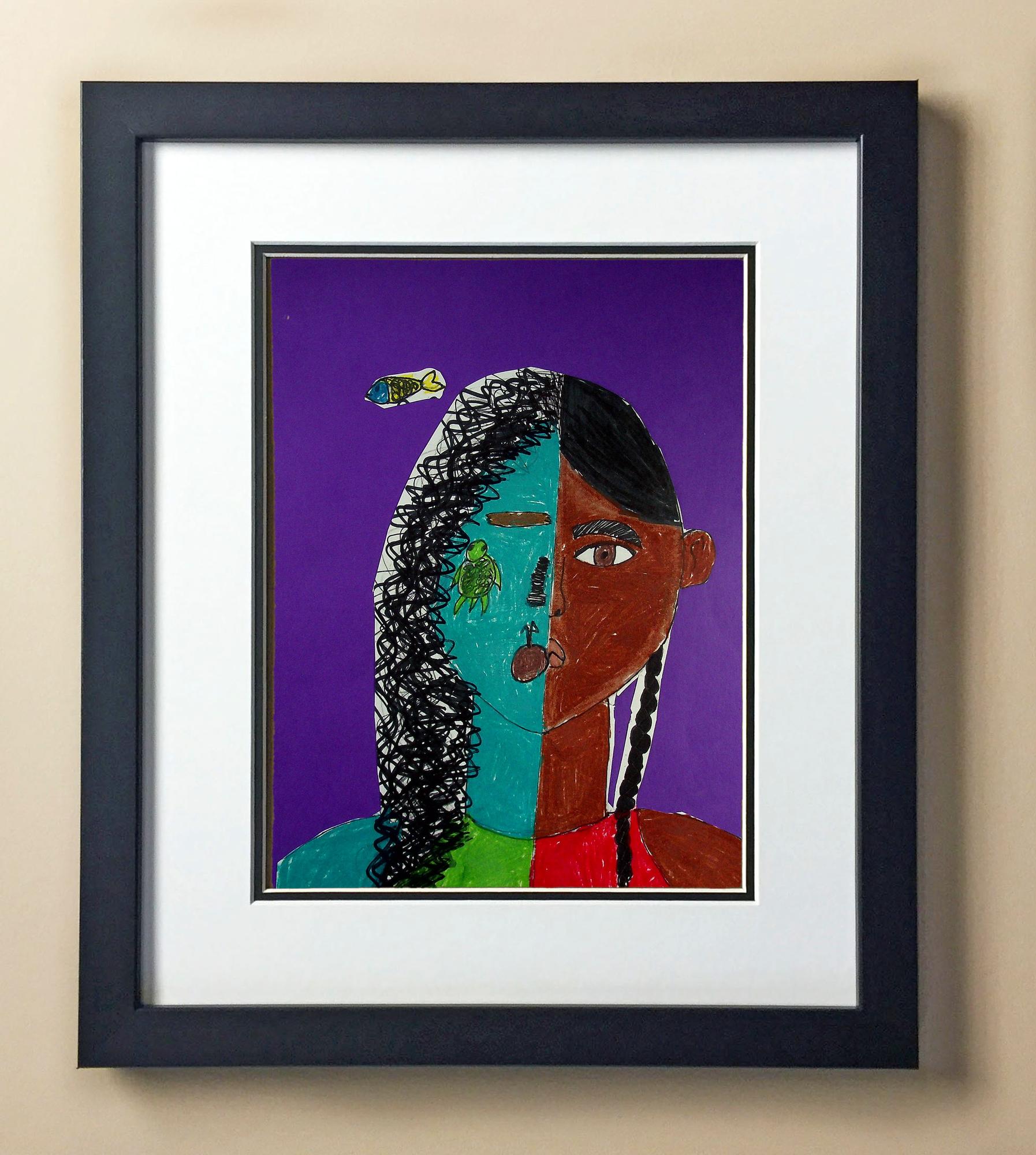 Included with the purchase is the Students Artwork, Frame, double matboard, shatter proof plexiglass, and a ready to hang backerboard with turnbuttons