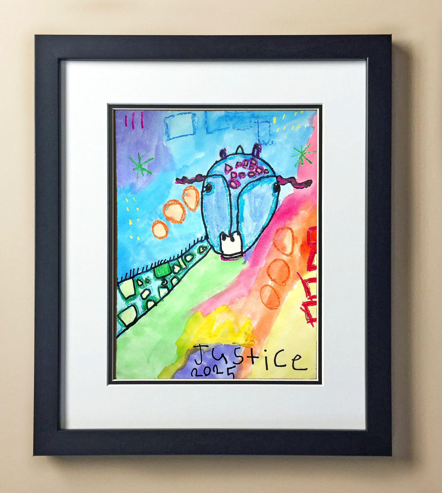 Included with the purchase is the Students Artwork, Frame, double matboard, shatter proof plexiglass, and a ready to hang backerboard with turnbuttons