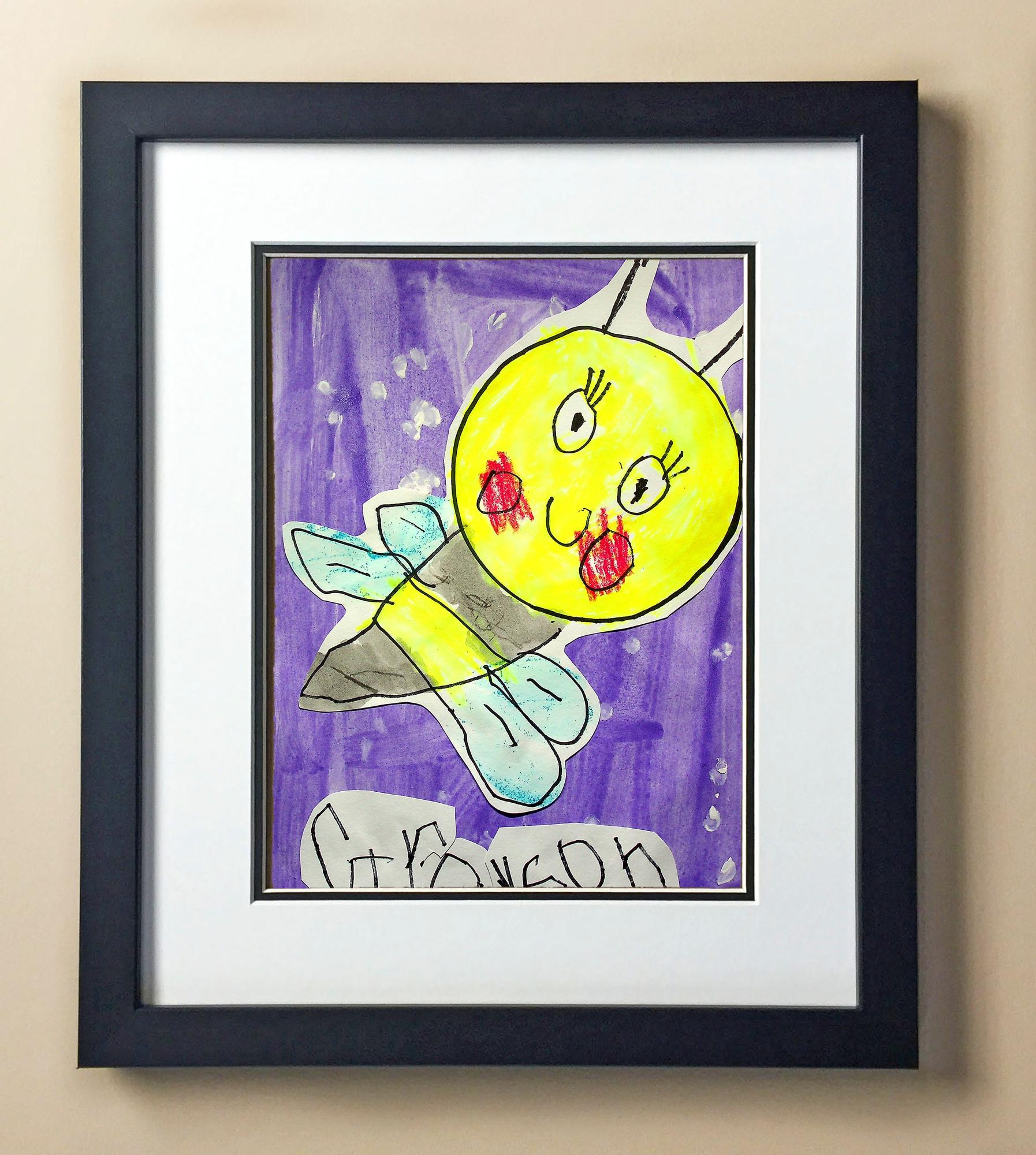 Included with the purchase is the Students Artwork, Frame, double matboard, shatter proof plexiglass, and a ready to hang backerboard with turnbuttons