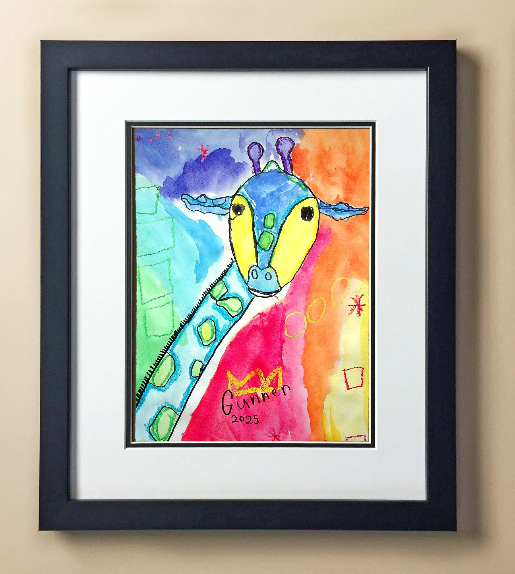 Included with the purchase is the Students Artwork, Frame, double matboard, shatter proof plexiglass, and a ready to hang backerboard with turnbuttons