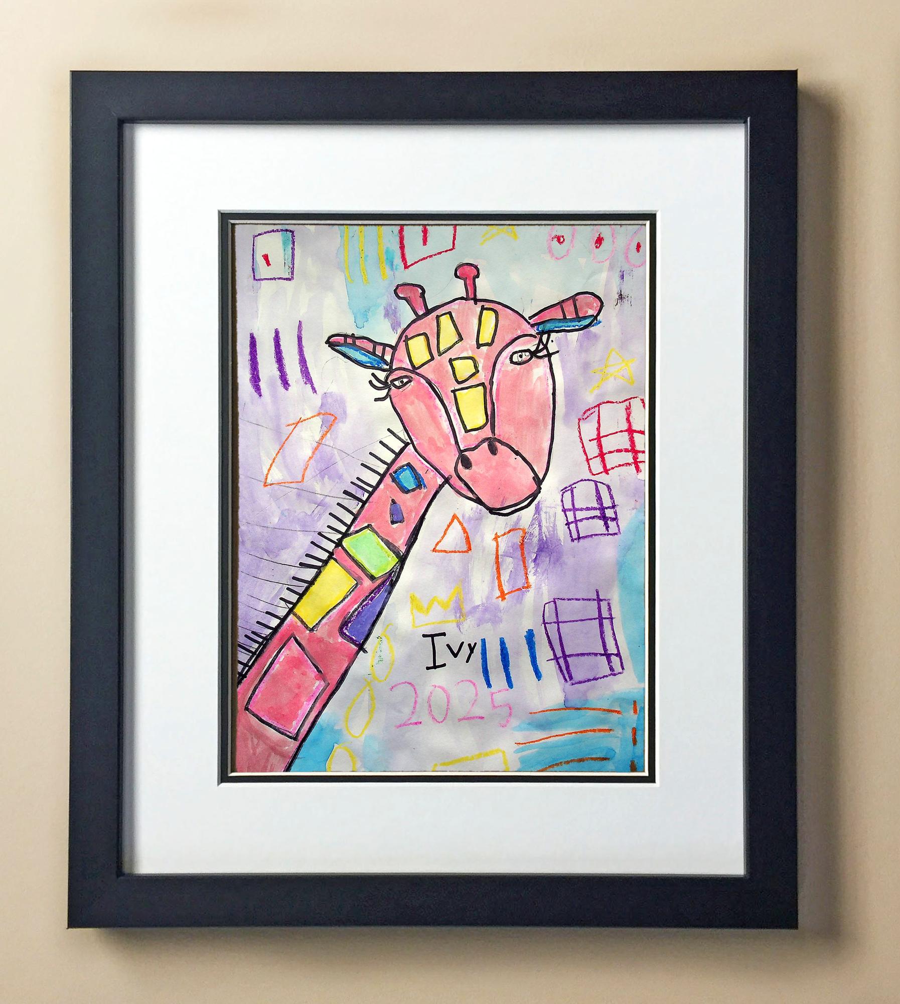 Included with the purchase is the Students Artwork, Frame, double matboard, shatter proof plexiglass, and a ready to hang backerboard with turnbuttons