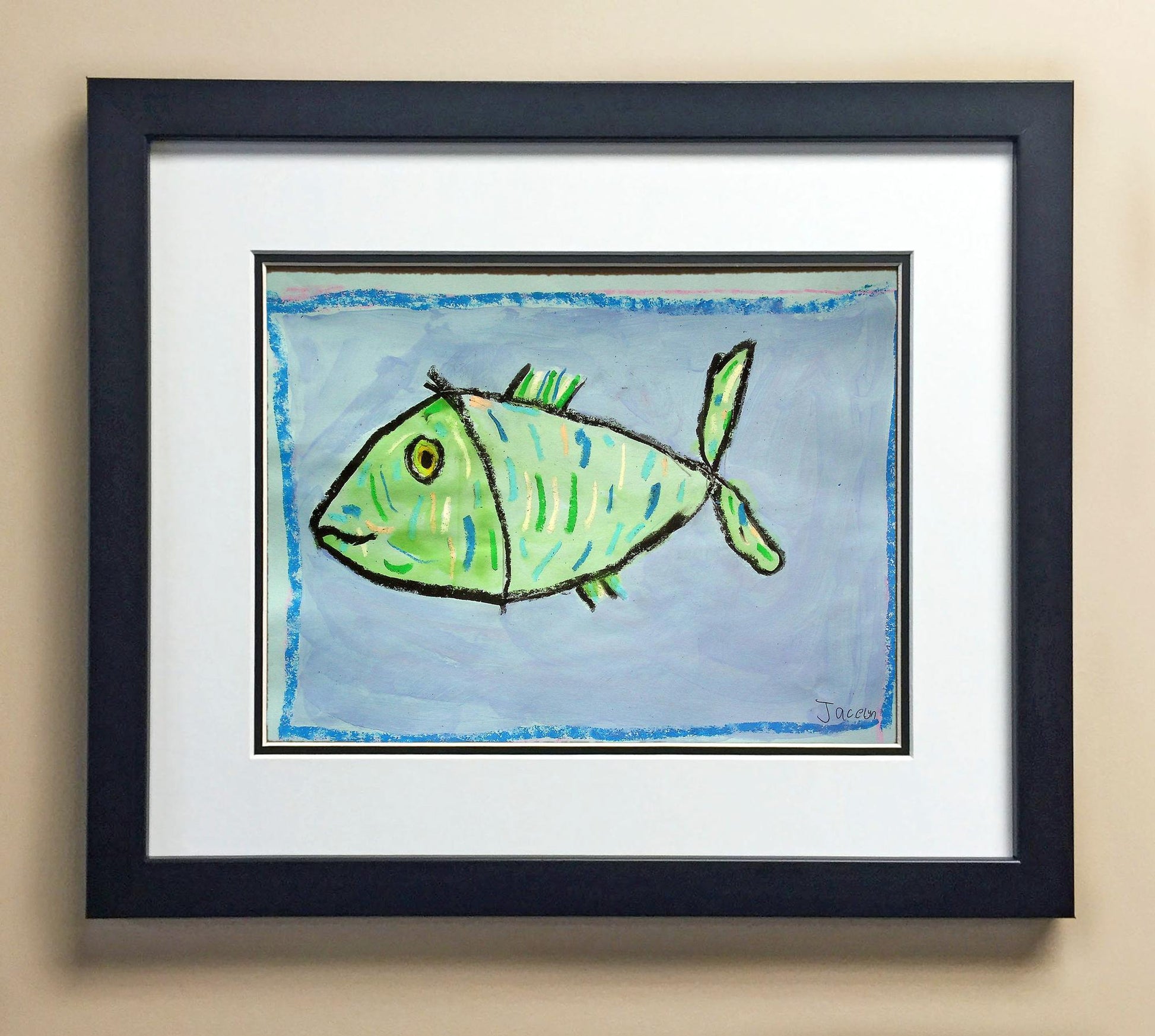 Included with the purchase is the Students Artwork, Frame, double matboard, shatter proof plexiglass, and a ready to hang backerboard with turnbuttons