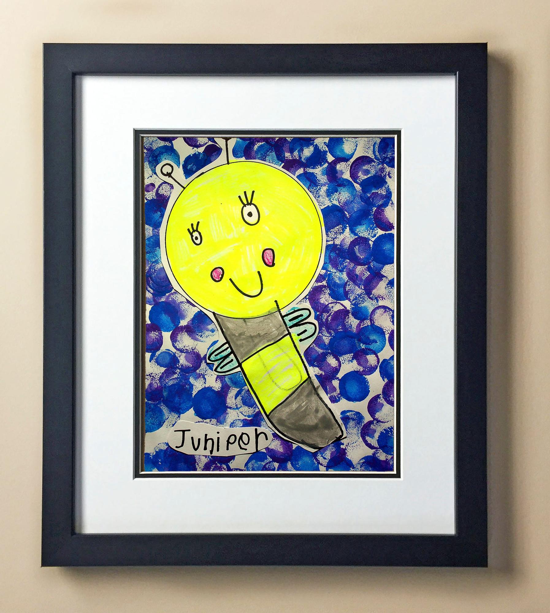 Included with the purchase is the Students Artwork, Frame, double matboard, shatter proof plexiglass, and a ready to hang backerboard with turnbuttons