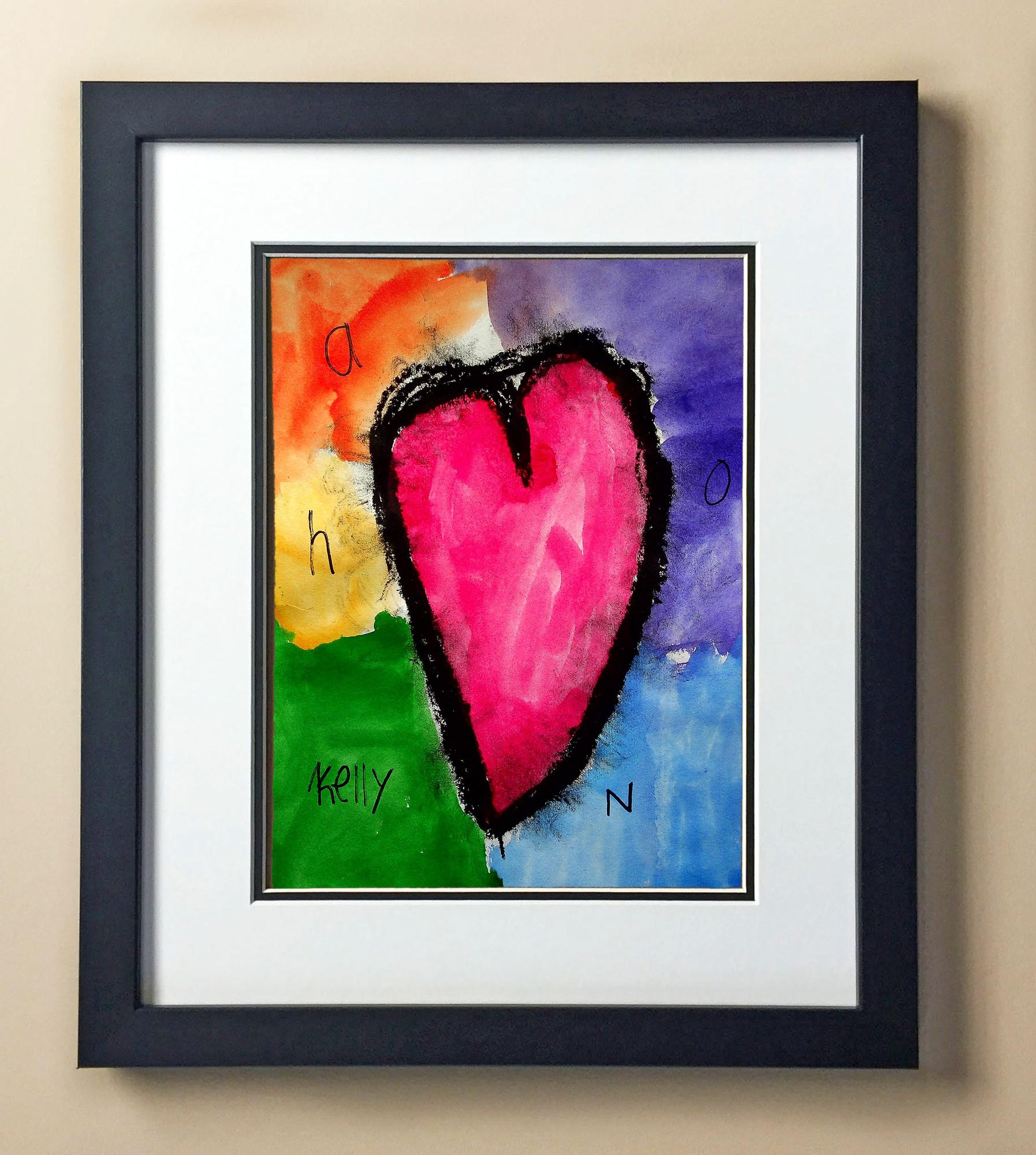 Included with the purchase is the Students Artwork, Frame, double matboard, shatter proof plexiglass, and a ready to hang backerboard with turnbuttons