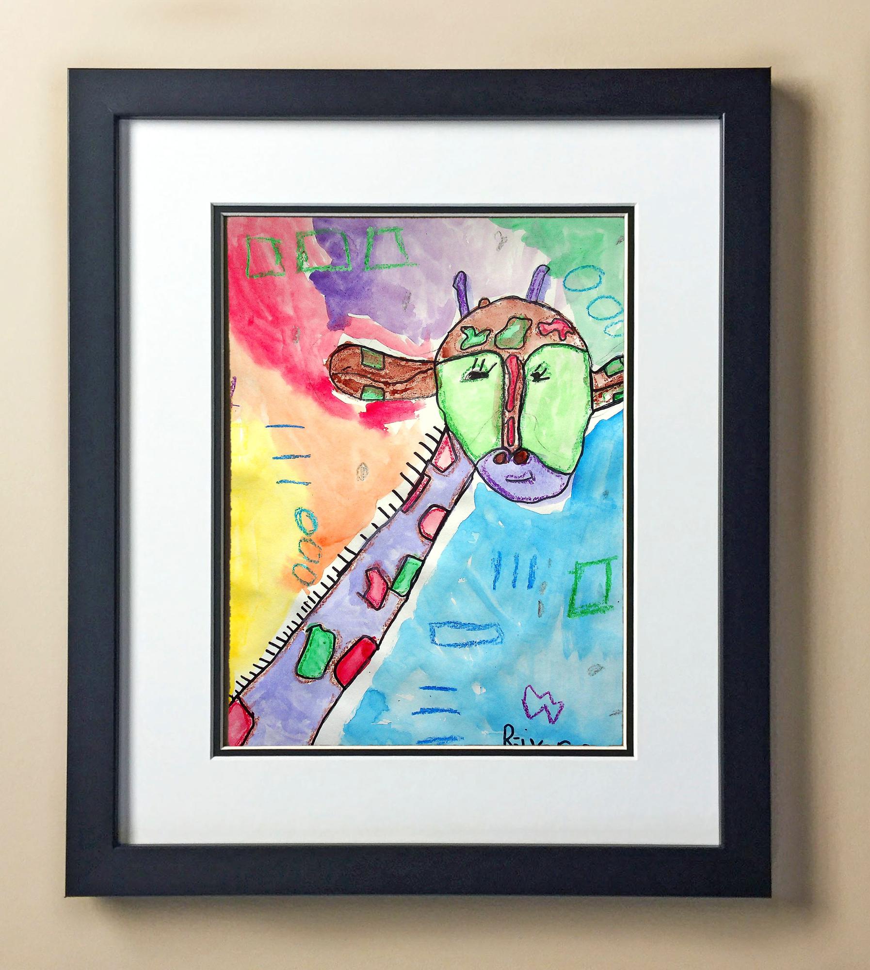 Included with the purchase is the Students Artwork, Frame, double matboard, shatter proof plexiglass, and a ready to hang backerboard with turnbuttons