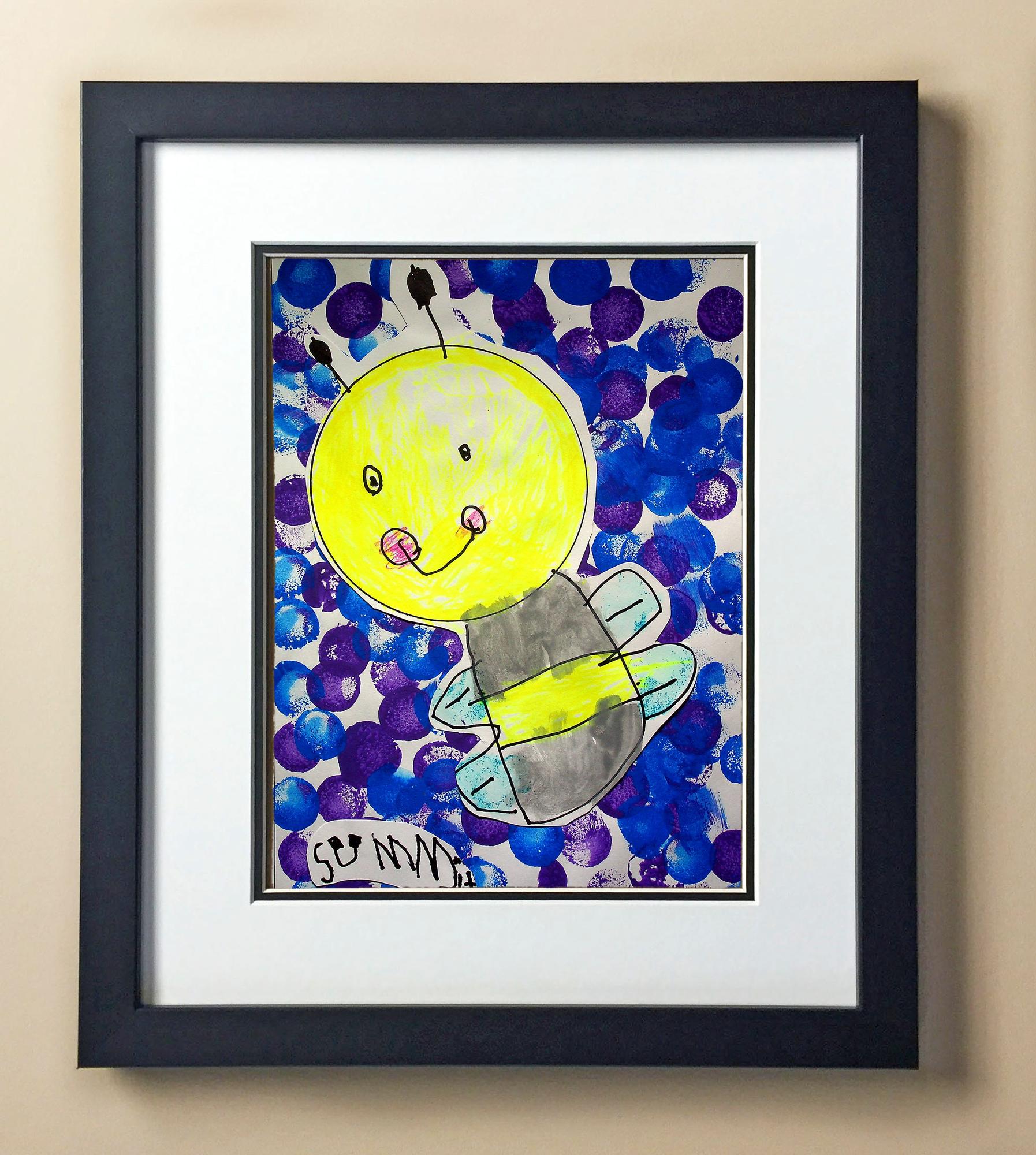 Included with the purchase is the Students Artwork, Frame, double matboard, shatter proof plexiglass, and a ready to hang backerboard with turnbuttons