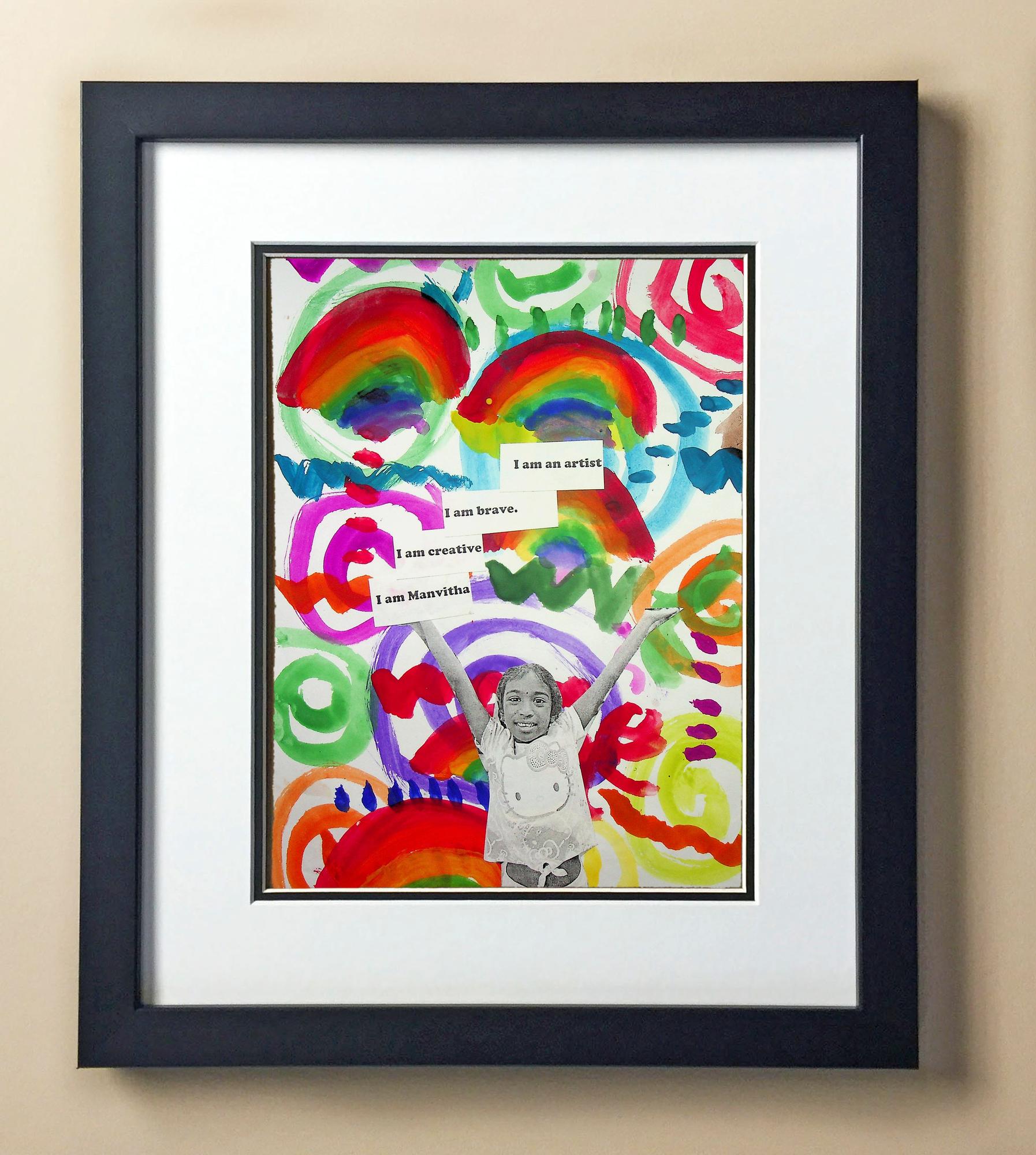 Included with the purchase is the Students Artwork, Frame, double matboard, shatter proof plexiglass, and a ready to hang backerboard with turnbuttons