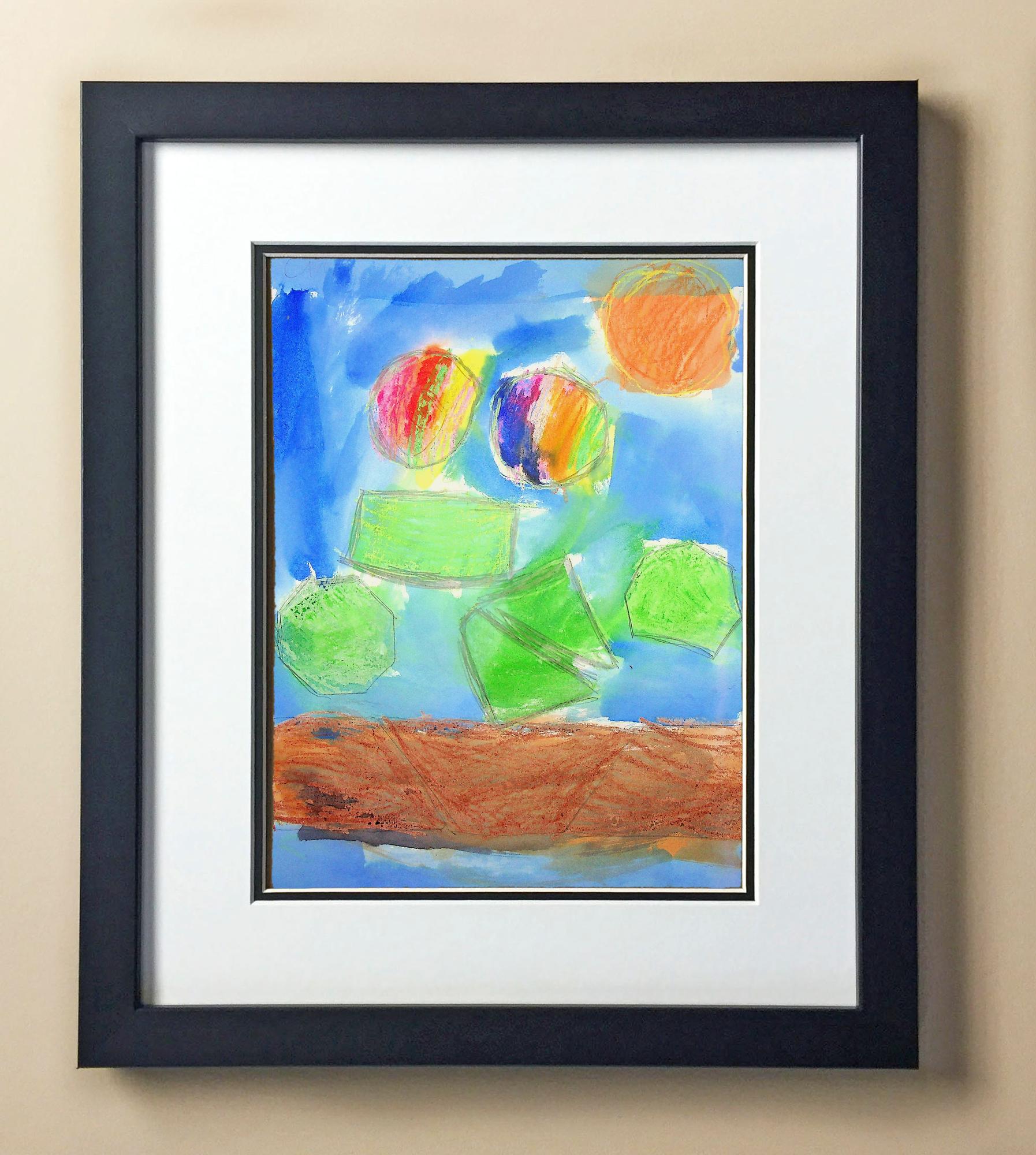 Included with the purchase is the Students Artwork, Frame, double matboard, shatter proof plexiglass, and a ready to hang backerboard with turnbuttons