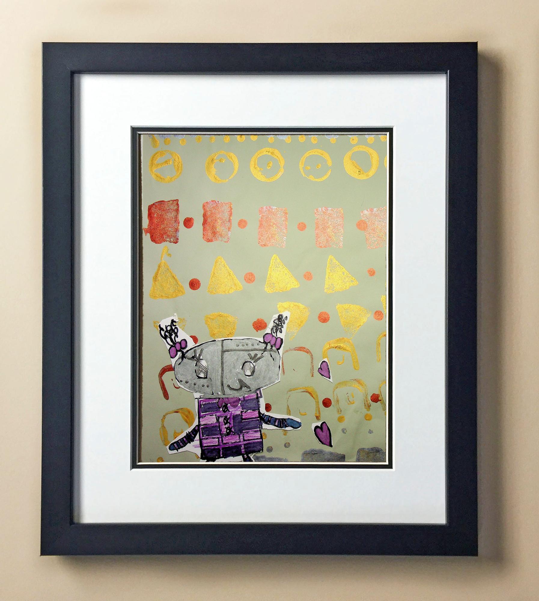 Included with the purchase is the Students Artwork, Frame, double matboard, shatter proof plexiglass, and a ready to hang backerboard with turnbuttons