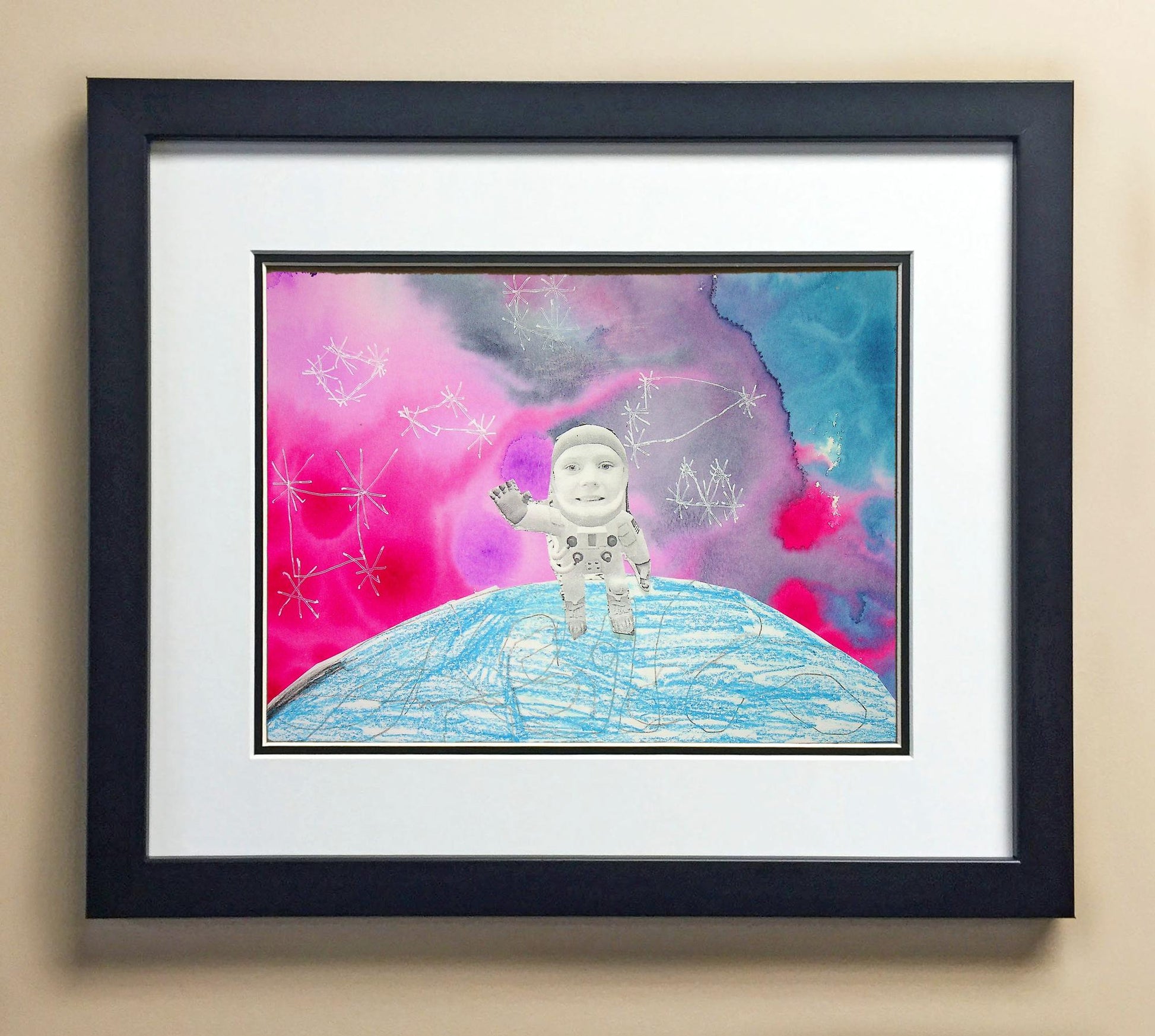 Included with the purchase is the Students Artwork, Frame, double matboard, shatter proof plexiglass, and a ready to hang backerboard with turnbuttons