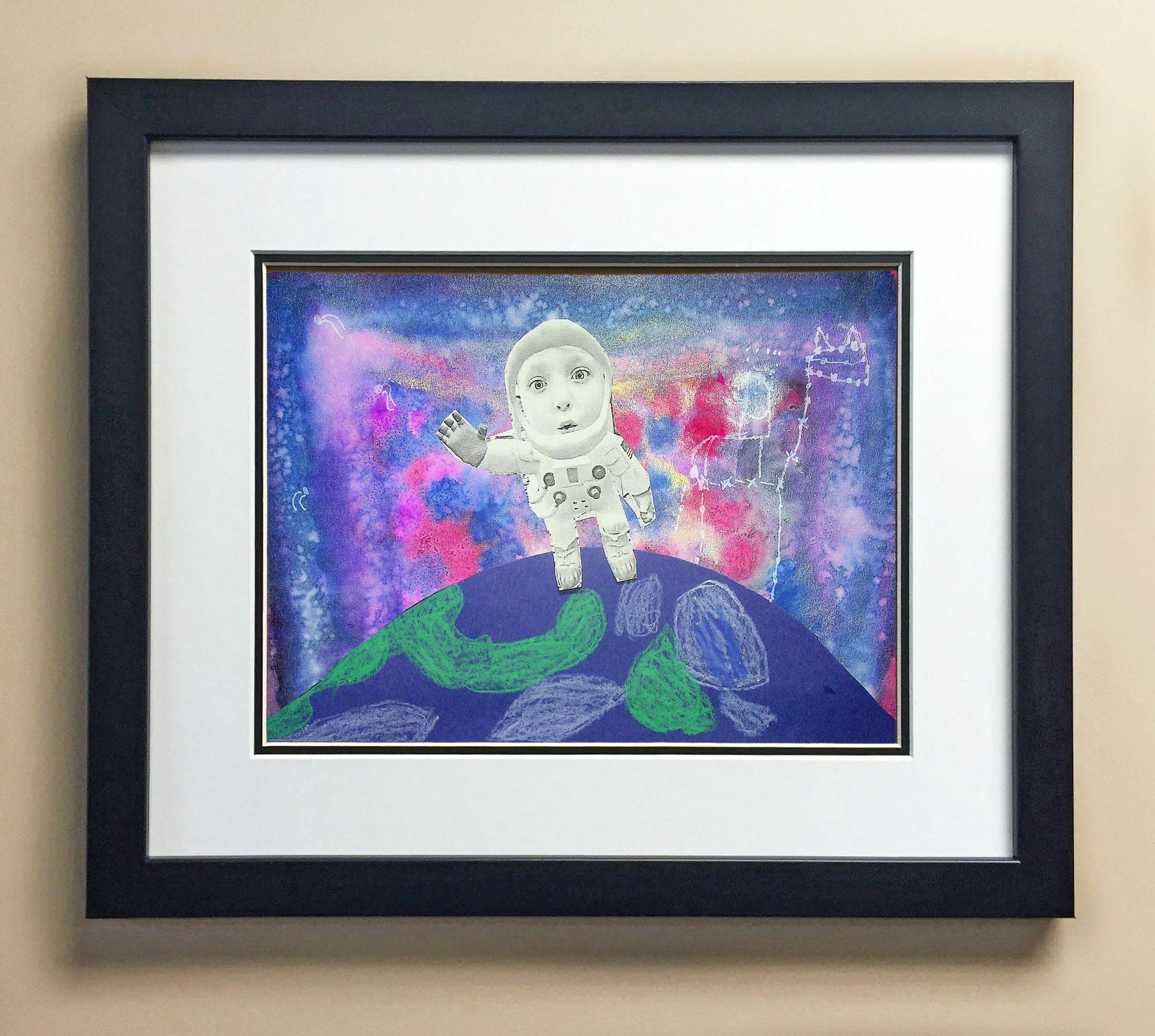 Included with the purchase is the Students Artwork, Frame, double matboard, shatter proof plexiglass, and a ready to hang backerboard with turnbuttons