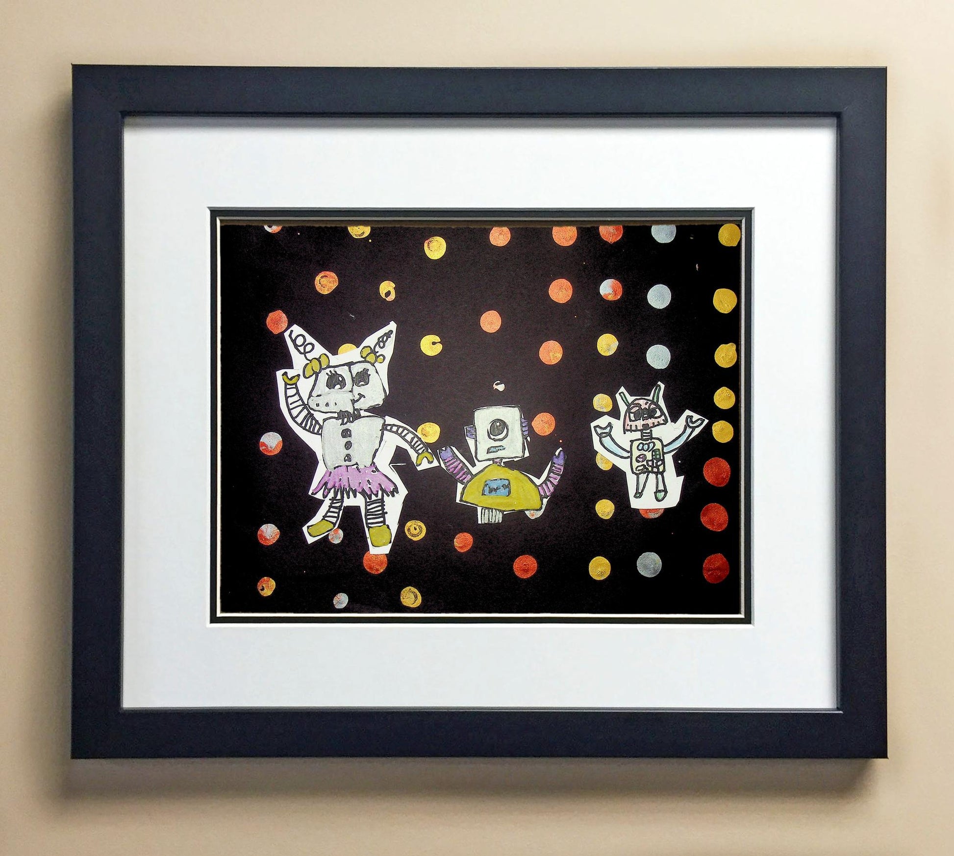Included with the purchase is the Students Artwork, Frame, double matboard, shatter proof plexiglass, and a ready to hang backerboard with turnbuttons