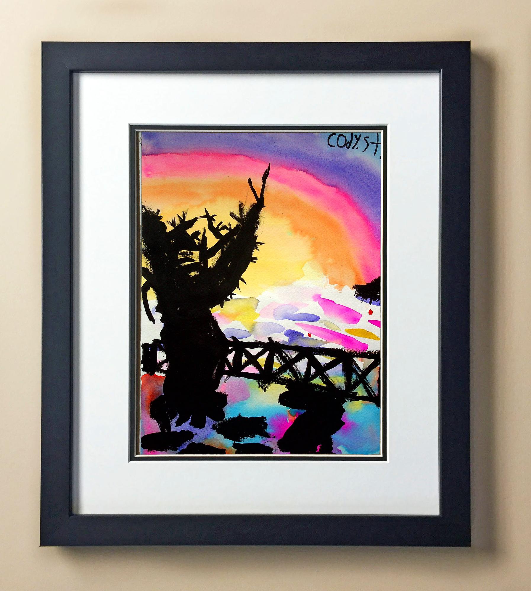 Included with the purchase is the Students Artwork, Frame, double matboard, shatter proof plexiglass, and a ready to hang backerboard with turnbuttons